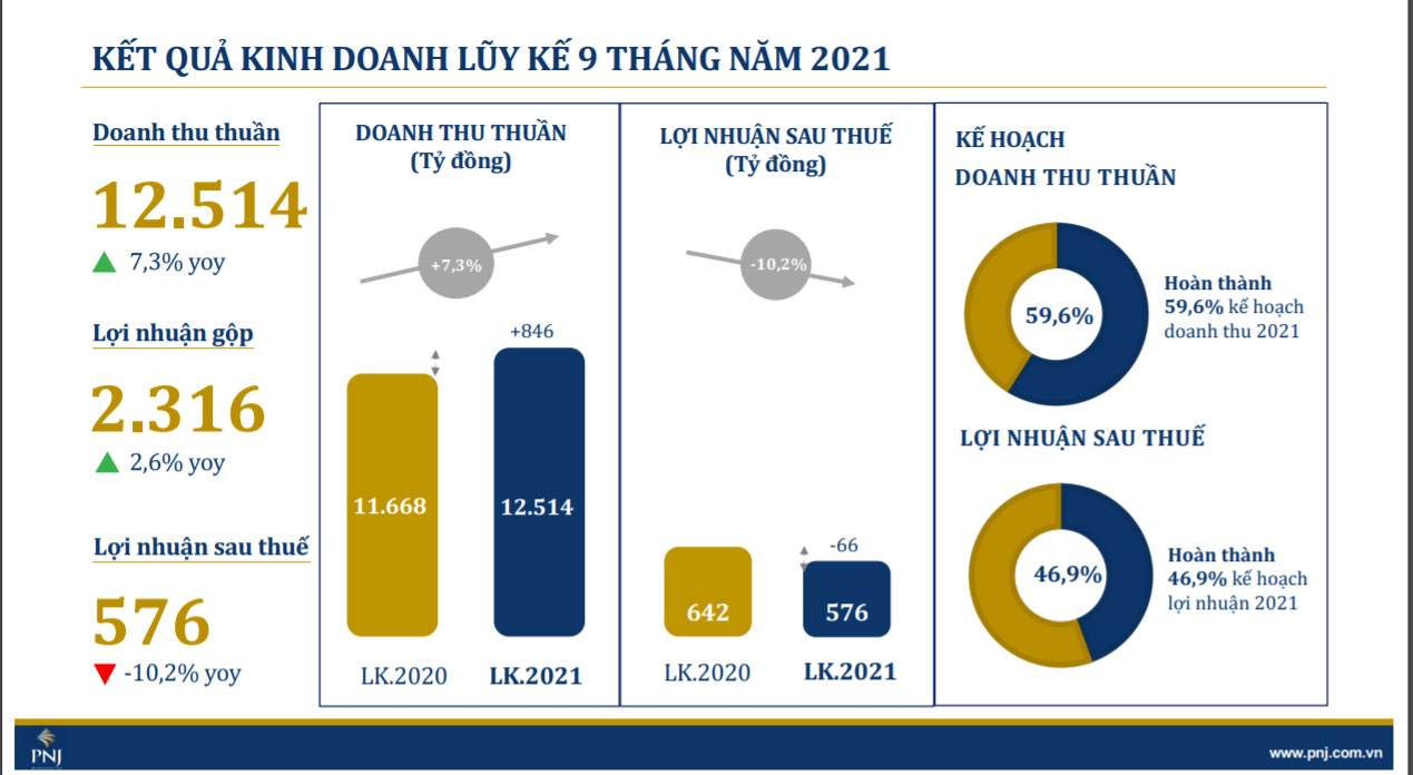 Lũy kế 9 tháng đầu năm, PNJ ghi nhận doanh thu thuần đạt 12.514 tỷ đồng, tăng 7,3% so với cùng kỳ và hoàn thành 59,6% kế hoạch năm 2021 và lợi nhuận sau thuế đạt 576 tỷ đồng, giảm 10,2% so với cùng kỳ và hoàn thành 46,9% kế hoạch năm 2021.