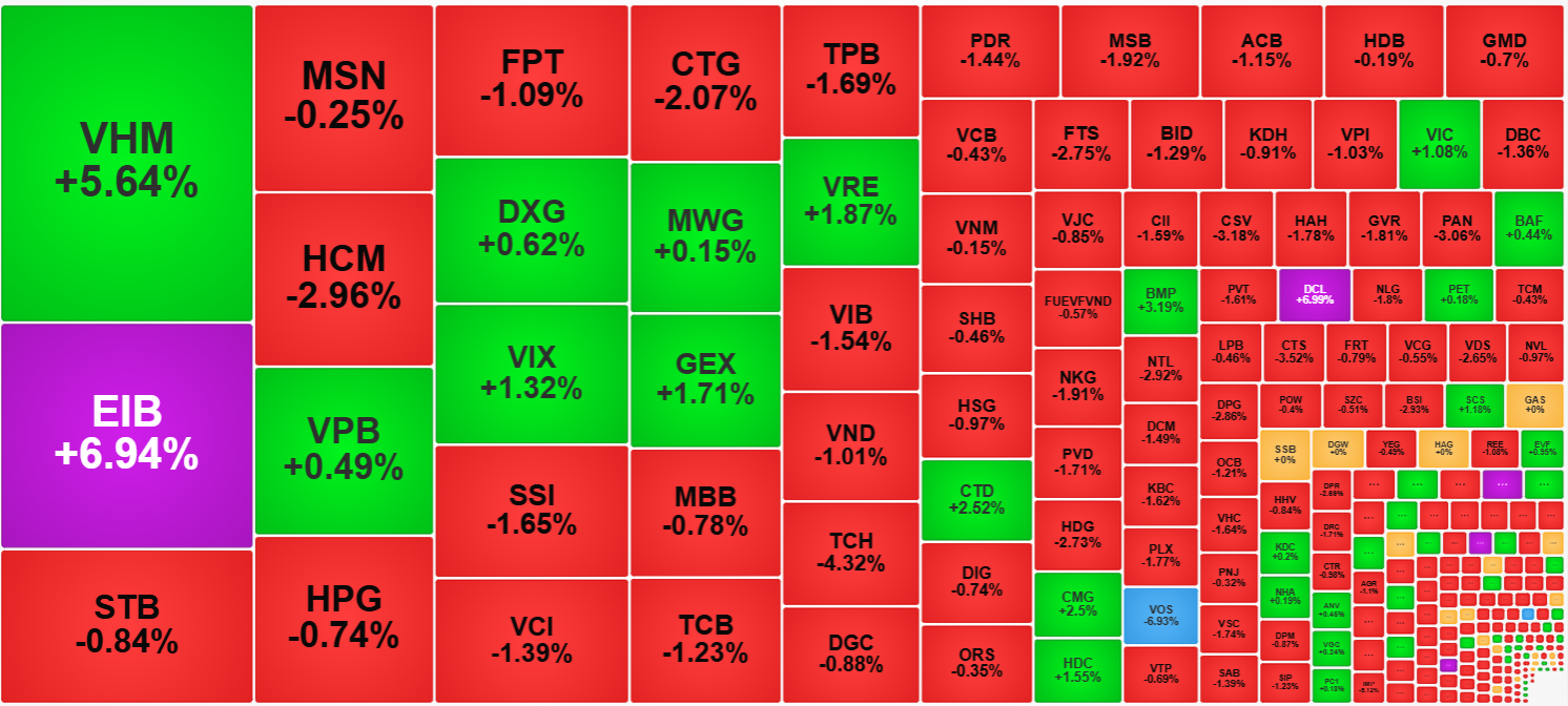 Chiều nay mặc dù VHM tăng khỏe hơn buổi sáng nhưng điều đó vẫn là vô ích: Áp lực bán lan rộng khắp bảng điện đẩy hàng loạt cổ phiếu lớn khác giảm và kích hoạt đợt bán tháo. VN-Index giảm liên tục trong phiên chiều và đóng cửa ở mức thấp nhất...