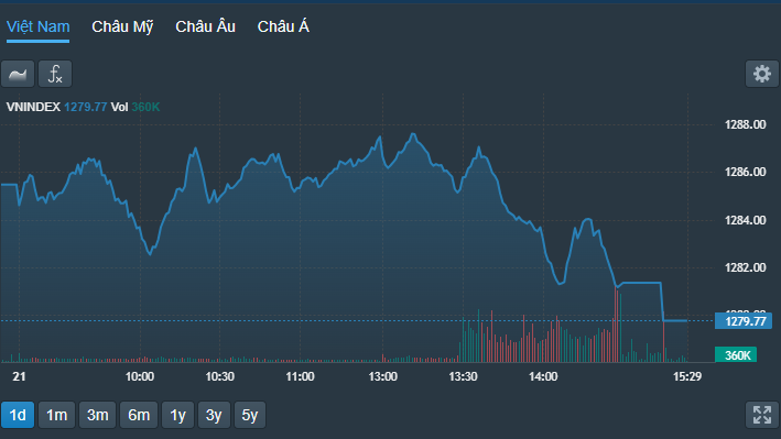 Cả rổ VN30 chiều nay chỉ có 4 mã giá lên cao hơn phiên sáng, nhưng tới 24 mã tụt dốc. Cổ phiếu ngân hàng nhiều mã tụt tới hơn 1% và đảo chiều như ACB, BID, TCB, TPB, VIB. Sức nặng của cổ phiếu ngân hàng là rất đáng kể nên nhóm Vin chỉ có thể làm giảm tác động chứ không thể kiềm hãm được đà lao dốc. VN-Index đóng cửa về mức 1279,77 điểm là mức thấp nhất trong ngày.