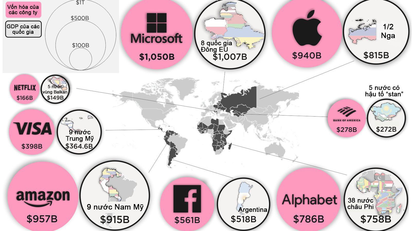 Đa số các công ty có vốn hóa cao tại Mỹ hiện đều thuộc các ngành như công nghệ hoặc tài chính, trong đó, Microsoft mới đây một lần nữa vượt qua mốc vốn hóa 1.000 tỷ USD. Vốn hóa của các công ty này thậm chí lớn hơn GDP của nhiều quốc gia đang phát triển cộng lại, đặc biệt là ở khu vực Đông Âu, châu Phi và Mỹ Latinh.