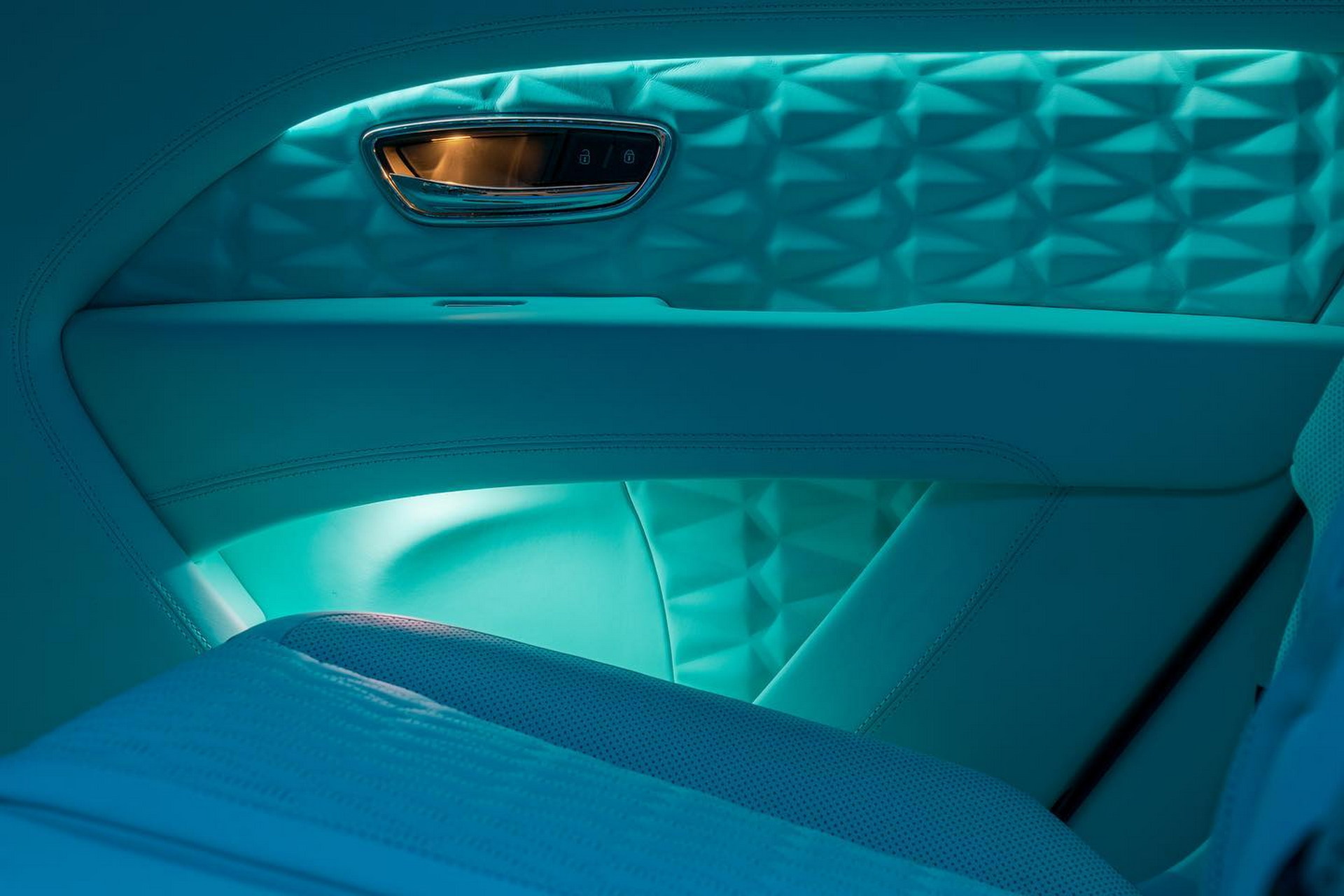 Bentayga sửa đổi được trang bị sợi carbon đặc trưng của Mansory trên nắp ca-pô, gương và các bộ phận khí động học, tương phản với ngoại thất màu xanh ngọc sáng.