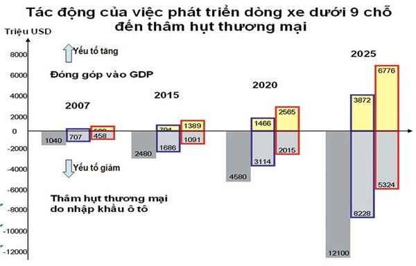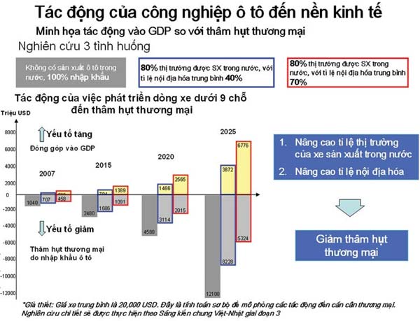 Từ những sức ép đó, các chuyên gia của Bộ Công Thương đã “cảnh báo” rằng nếu không kịp phát triển sản xuất trong nước với các dòng sản phẩm đủ sức cạnh tranh cả về chất lượng và giá bán, sau 10 năm nữa có thể Việt Nam sẽ phải chấp nhận chi đến 12 tỷ USD/năm để nhập khẩu ôtô.