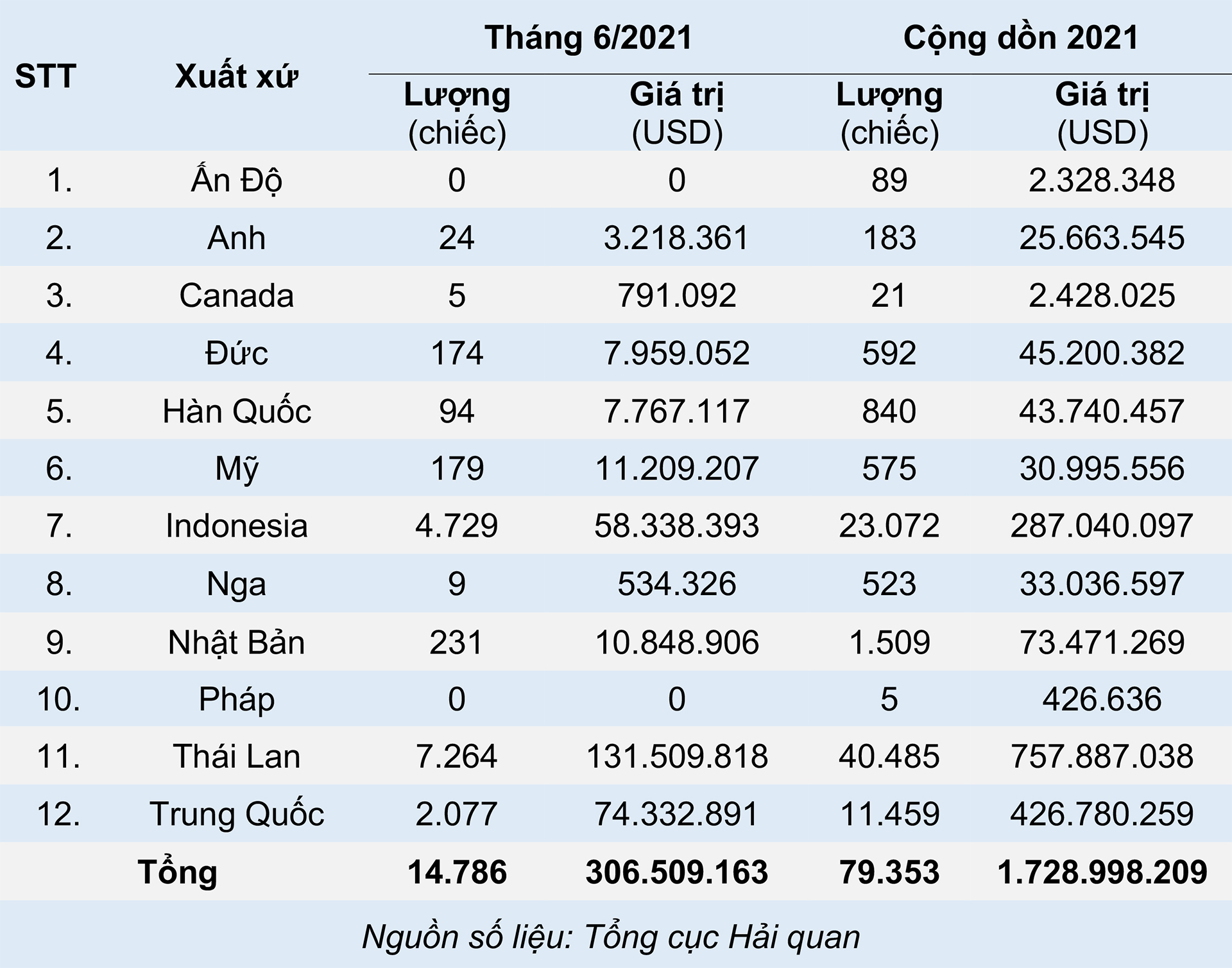 Tính riêng trong tháng 6/2021, Việt Nam cũng đã nhập khẩu 7.264 xe ô tô nguyên chiếc từ Thái Lan, đạt giá trị hơn 131 triệu USD, giảm nhẹ so với tháng liền trước. Trong khi đó, xe nhập khẩu từ Indonesia lại ngược chiều tăng nhẹ, đạt 4.729 chiếc và hơn 58 triệu USD.