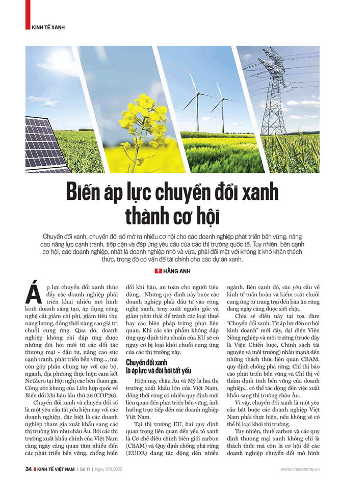 Áp lực chuyển đổi xanh thúc đẩy các doanh nghiệp phải triển khai nhiều mô hình kinh doanh sáng tạo, áp dụng công nghệ cắt giảm chi phí, giảm tiêu thụ năng lượng, đồng thời nâng cao giá trị chuỗi cung ứng. Qua đó, doanh nghiệp không chỉ đáp ứng được những đòi hỏi mới từ các đối tác thương mại- đầu tư, nâng cao sức cạnh tranh, phát triển bền vững..., mà còn góp phần chung tay với các bộ, ngành, địa phương thực hiện cam kết NetZero tại Hội nghị các bên tham gia Công ước khung của Liên hợp quốc về Biến đổi khí hậu lần thứ 26 (COP26).