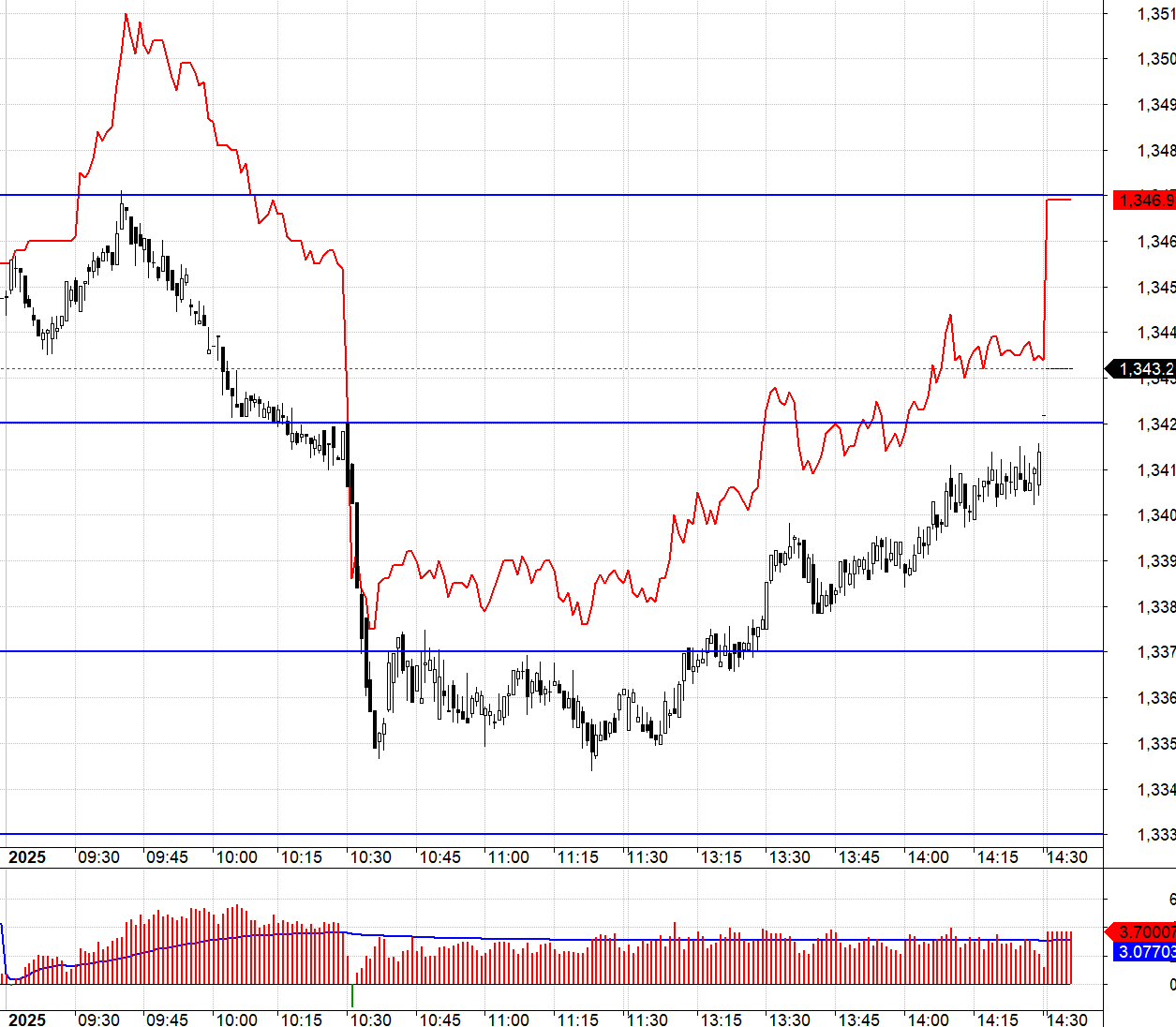 Khi VN30 thủng 1337.xx thì F1 lại đảo basis. Nếu có chút kinh nghiệm với phái sinh thì các lệnh đóng vị thế đã được treo sẵn từng vùng điểm chứ không phải tới lúc đó mới xuất hiện. VN30 đi ngang kéo dài dưới 1337.xx nhưng F1 cũng đi ngang và giữ basis dương. Điểm vào Long trở lại nên đợi lúc VN30 vượt hẳn 1337.xx, với basis chênh lệch 3 điểm thì có thể chọn mức này làm stoploss hoặc VN30 quay lại giảm xuống dưới 1337.xx tùy điều kiện nào đến trước. Kỳ vọng tối thiểu là VN30 hồi lên tới 1342.xx.