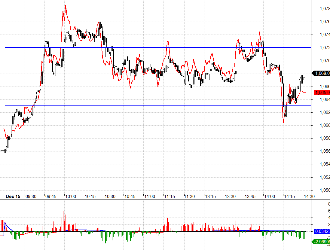 Thị trường phái sinh hôm nay đáo hạn, tuy basis chặt nhưng cũng không có nhiều điểm vào đạt chuẩn, một phần vì biên độ giữa các mốc xác định trước là rộng. VN30 có một điểm cắt lên 1063.xx đầu phiên và hướng tới 1072.xx phù hợp với Long, nhưng điểm vượt 1072 thì không tới được 1080. Điểm vào Short ở nhịp rơi lúc 2h khi VN30 phản ứng với 1072.xx thì quá nhanh. Nói chung giao dịch hôm nay bị nhiễu.
