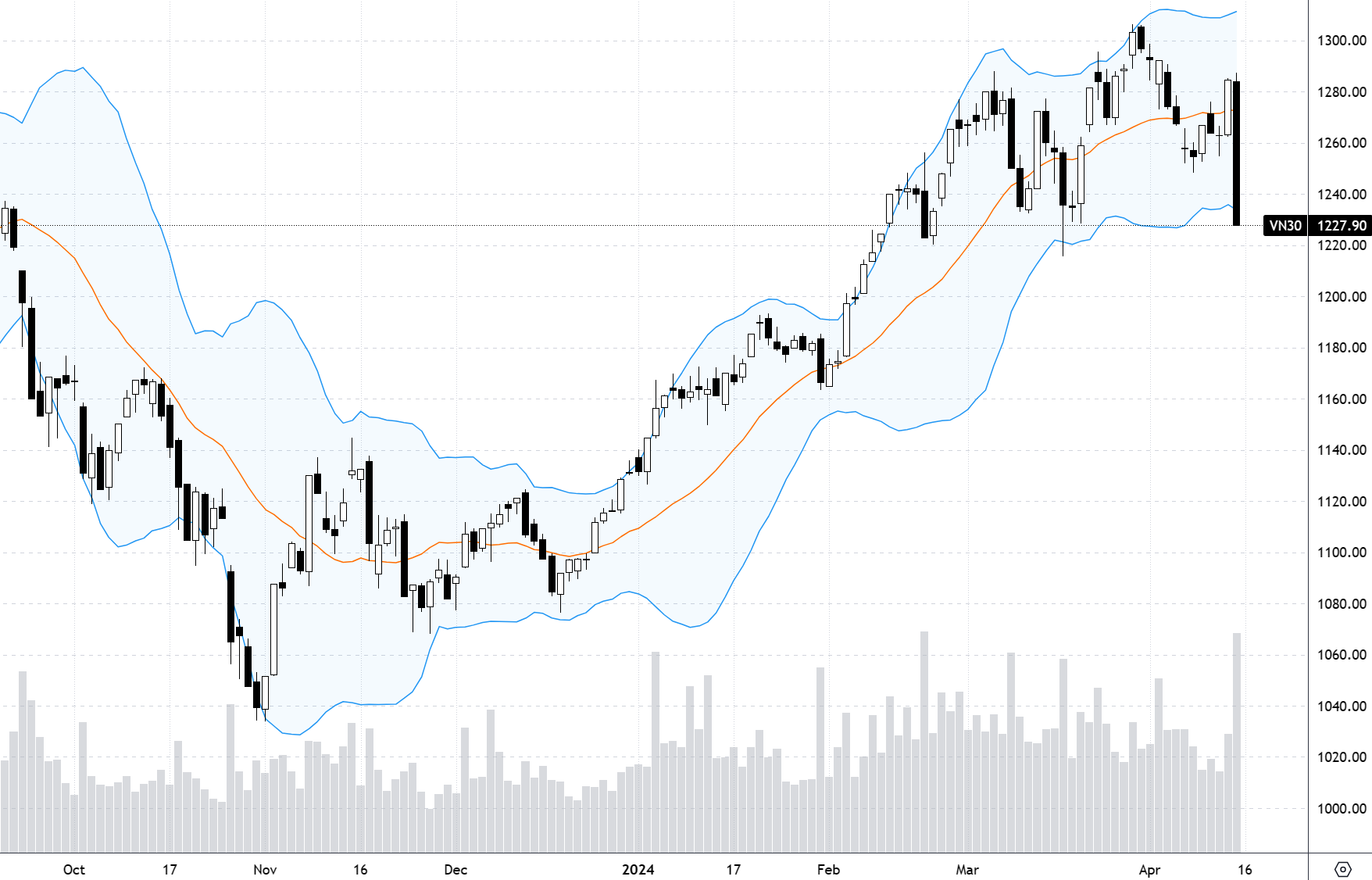 VN30 chốt hôm nay tại 1227.9 điểm. Cản gần nhất ngày mai là 1236; 1245; 1250; 1258; 1262. Hỗ trợ 1226; 1219; 1210; 1202; 1197; 1188.