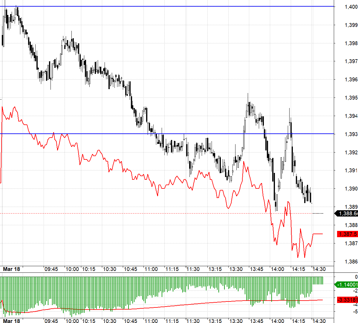 Thị trường phái sinh hôm nay mở rộng chiết khấu cả F1 lẫn F2 trong buổi sáng, nhất là nửa đầu phiên. Điều này làm hạn chế cơ hội Short vì ngay sau khi mở cửa VN30 đã leo lên 1400 và không vượt qua được. Basis F1 chiết khấu gần 6 điểm khi đã sát ngày đáo hạn là quá bất lợi cho Short vì dù kể cả khi VN30 trượt giảm thì F1 khả năng cao sẽ chỉ co basis chứ không giảm theo. Quả thực từ 1400 chỉ số rơi xuống 1393.xx và thủng nhẹ mức này thì biên độ giảm của F1 cũng rất ít. Buổi chiều có một nhịp kéo VN30 vượt 1393 nhưng lại là bẫy cho Long. Nói chung hôm nay khó giao dịch.