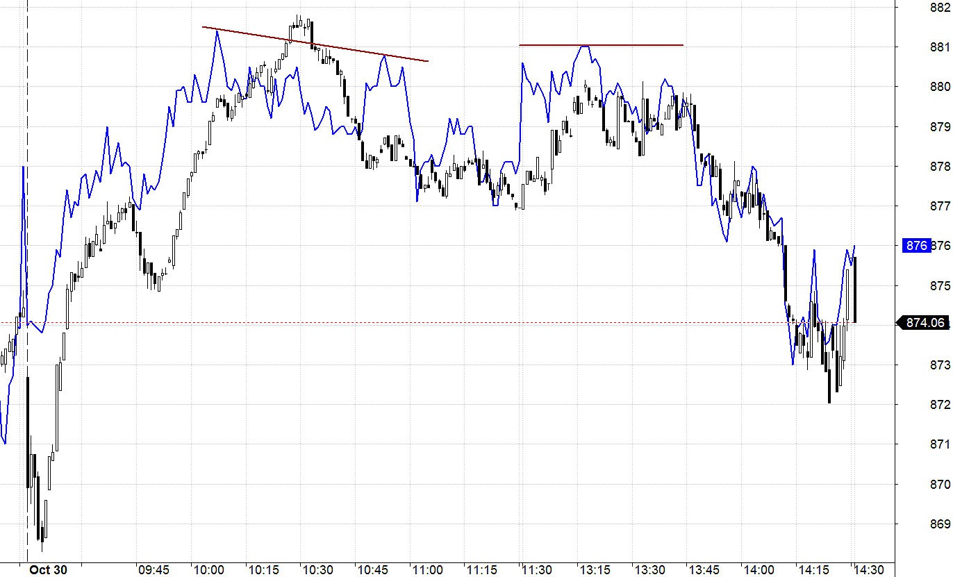 Vẫn theo chiến lược Short nhưng cơ hội không nhiều vì VN30 dao động khá nhiễu không gặp kháng cự hay hỗ trợ nào tính trước. Lúc gần 11h đột nhiên hợp đồng nhảy vọt lên 881, sát đỉnh gần nhất trong khi VN30 tụt xa. Short nhưng không kịp vì diễn biến quá nhanh.