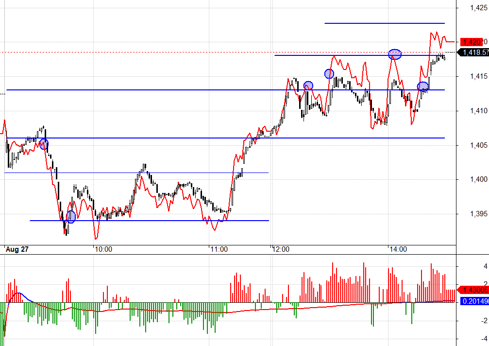Nhịp Short đầu giờ chiều không tốt, khoảng 1h15 Vn30 test 1413, F1 cao hơn 1413, Short 1413.5 với kịch bản VN30 quay xuống 1406, nhưng chỉ số chỉ chỉnh nhẹ rồi lại lên, cắt lỗ khi F1 vượt đỉnh ở 1416. Lúc sau 2h VN30 lửng lơ ở 1414, tương đương với 2 đỉnh của chỉ số này đầu phiên chiều và phía trên có cản 1418 trong khi F1 lại chạy trước vượt 1418, Short 1418, stoploss nếu VN30 vượt 2 đỉnh liền trước. VN30 không tăng lên test 1418 như dự kiến mà thủng 1413. Tuy nhiên chỉ số cũng không tới 1406, cover 1416.