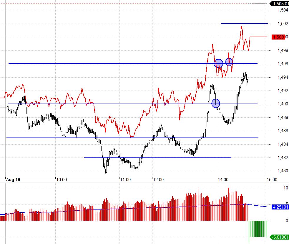 F1 không có điểm Long/Short nào đạt yêu cầu hôm nay. Lúc 2h VN30 vừa chớm qua 1490 rồi quay đầu xuống dưới mức này, F1 vọt qua 1496 và cũng quay đầu, Short 1496. Kịch bản là nếu VN30 tuột tiếp xuống 1485 thì basis có thể co lại chặt hơn. Tuy nhiên basis lại mở rộng hơn, cắt lỗ 1497 khi VN30 không tới 1485 mà F1 lại vòng lại lên trên 1496.