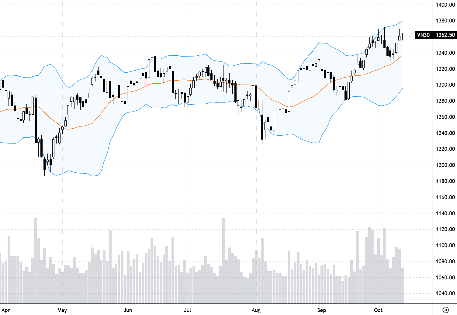 VN30 chốt hôm nay tại 1362.5. Cản gần nhất phiên tới là 1364; 1371; 1376; 1380; 1387; 1395; Hỗ trợ 1358; 1348; 1341; 1333.
