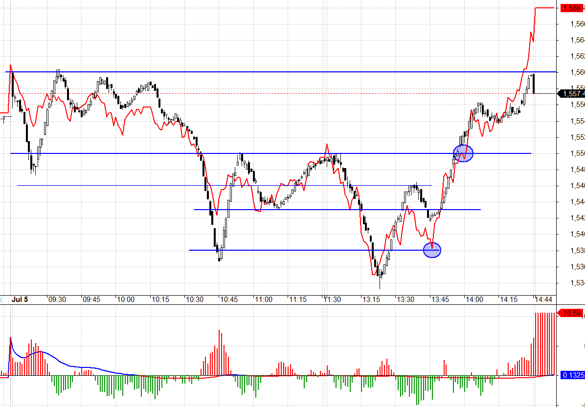 Sáng bận không giao dịch, chiều tập trung vào cổ phiếu. F1 bám rất sát VN30 và buổi chiều cũng có 2 setup khá tốt. Đầu tiên là lúc 1h45, VN30 retest 1543 nhưng F1 tụt xuống hỗ trợ dưới ở 1538. Có thể Long và stoploss một nửa nếu VN30 để thủng 1543 và stoploss hết nếu F1 thủng đáy. Với basis chặt thì khả năng cao hơn là F1 sẽ điều chỉnh bằng basis. Target chiều tăng cho VN30 khoảng 1550.