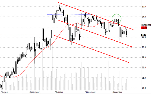 Kênh giảm giá của SSI tiếp tục được giữ vững và củng cố thêm. SSI thuộc nhóm cổ phiếu đã có một đáy ngắn hạn để tham chiếu và vẫn đang dao động trong vùng tích lũy rộng với xu thế giảm giá ngắn hạn. Vùng hỗ trợ ngắn hạn ở quanh 28.