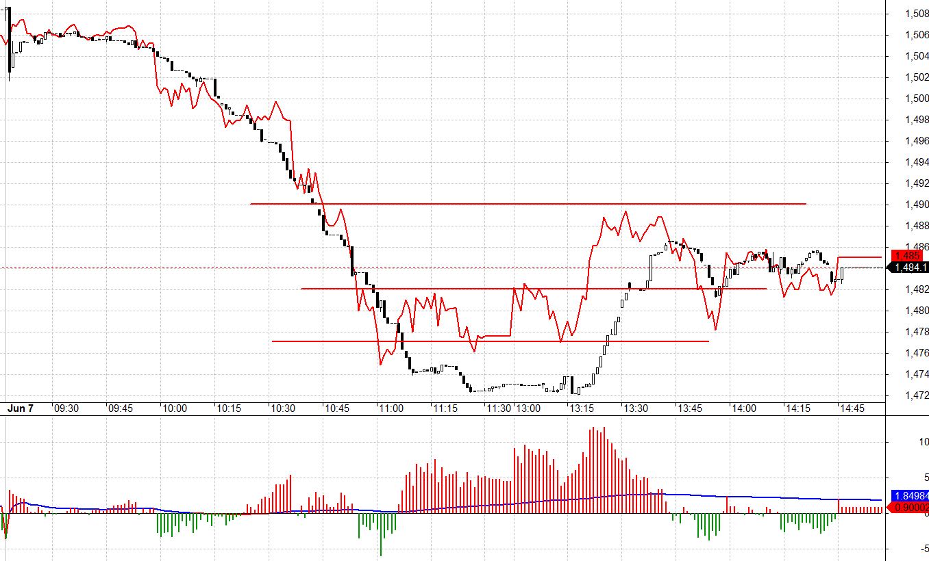 Sáng bận không giao dịch được, bỏ lỡ nhịp rơi tốt nhất ngày. VN30 đã giảm thủng ngưỡng tối đa dự kiến trước ở 1477.xx và dừng ở ngưỡng kế tiếp tại 1472.xx. Thấp hơn là 1466.xx. Điểm Long bắt đáy tốt là lúc 1h15, hệ thống nghẽn làm dừng đà giảm ở 1472 và F1 không thủng 1477. Cuối phiên sáng F1 có đáy ở 1474.