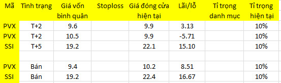 PVX dao động yếu xìu, hẹp hơn dự kiến. Bán PVX 10.2 cho T 2 như kế hoạch. SSI test 22.5 cũng rất yếu. Bán một nửa SSI 22.4, giá cover dự kiến 21.8.