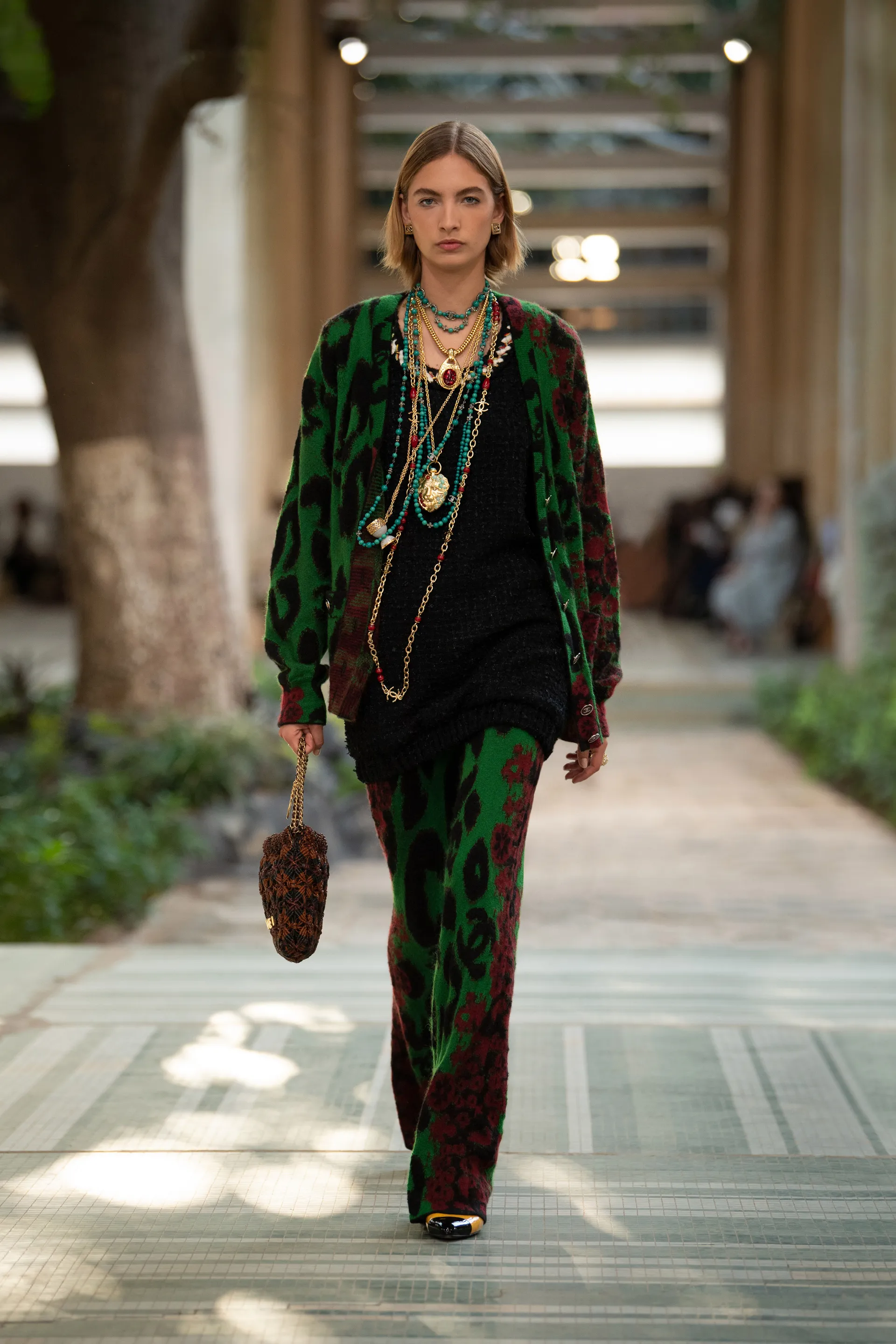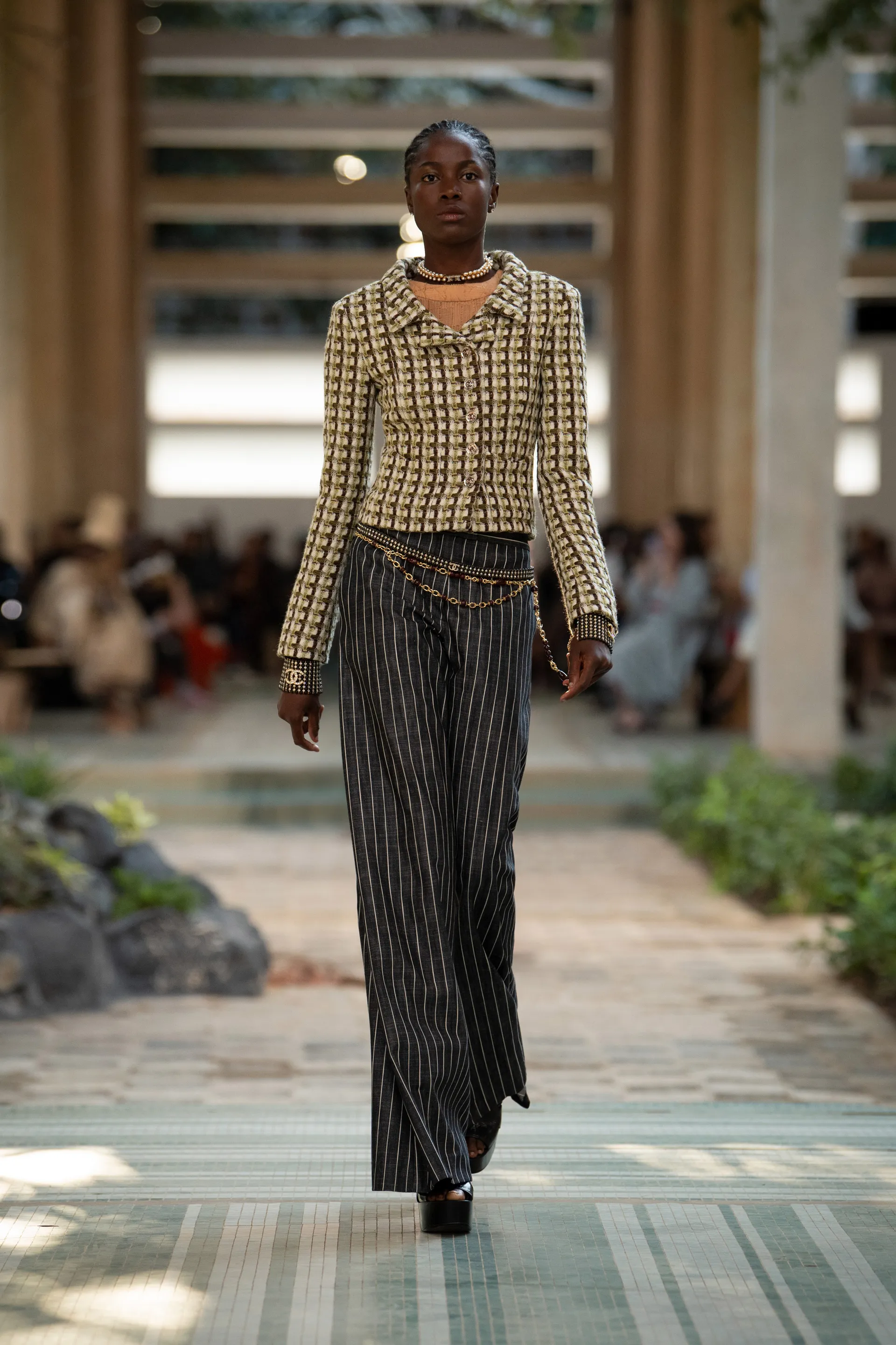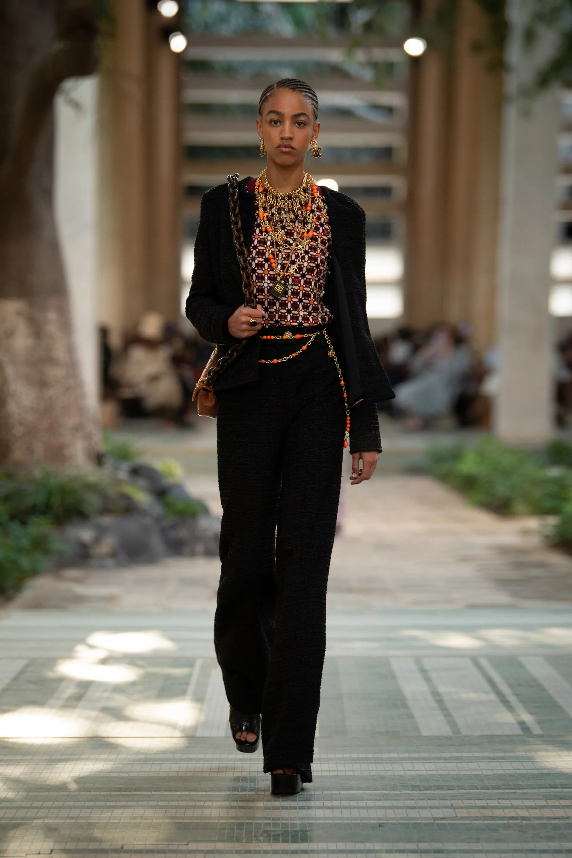Virginie Viard có thể tạo ra một chiếc váy Chanel cổ điển đáng yêu, và cô ấy đã làm điều đó ở đây, với một số kiểu dáng móc ren, váy dài cho tiệc cocktail trong vườn và những chiếc đầm tiệc tối đính sequin... Nhưng có vẻ như đây là bộ sưu tập dành để tôn vinh các thiết kế quần dài. Từ quần dệt kim, bouclé, ống loe, cho đến denim… được kết hợp với áo blouson, áo chẽn hoặc áo jacket may đo cẩn thận. Các tác phẩm thêu với những cụm hoa trà và ngọc trai nhiều màu rực rỡ, đan xen với các tuyệt tác trang sức cầu kỳ nằm trên trang phục đính kết sequins, cùng hàng đăng ten xếp nếp màu đen và trắng. Ở đó, họa tiết sư tử xuất hiện trên trang sức, túi xách và những khóa thắt lưng táo bạo đã cùng lúc gợi nhớ đến biểu tượng của đất nước Senegal và Gabrielle Chanel.