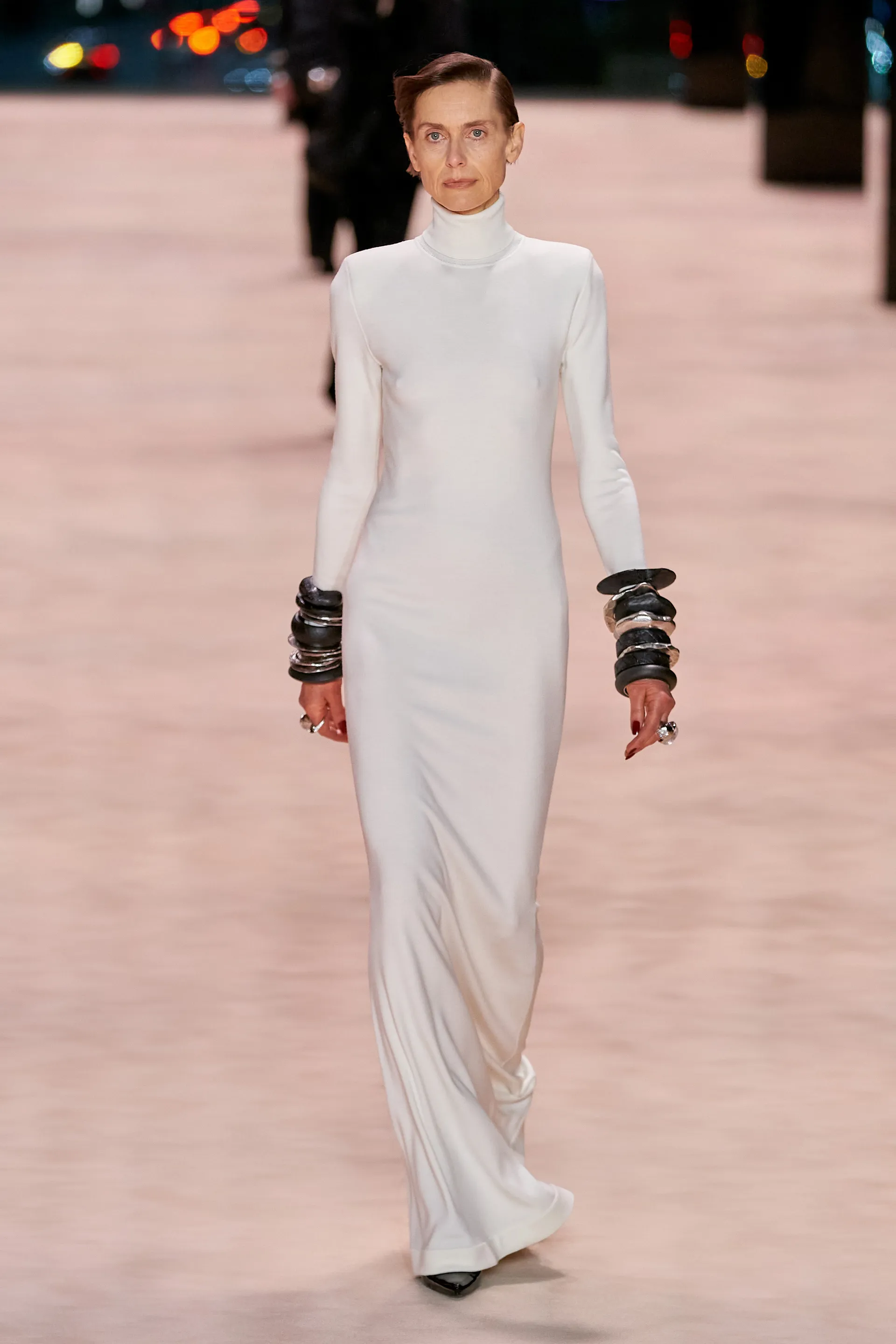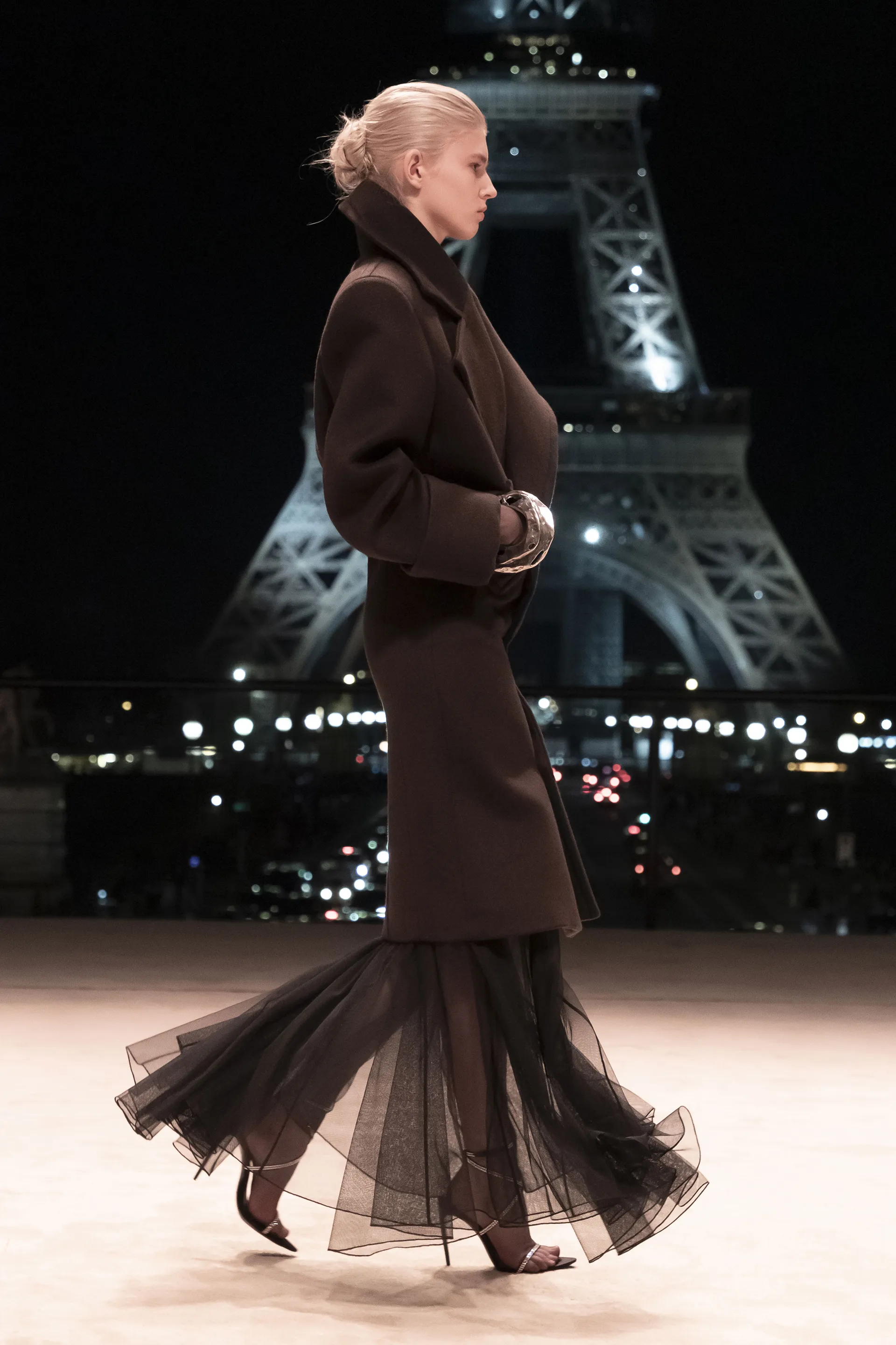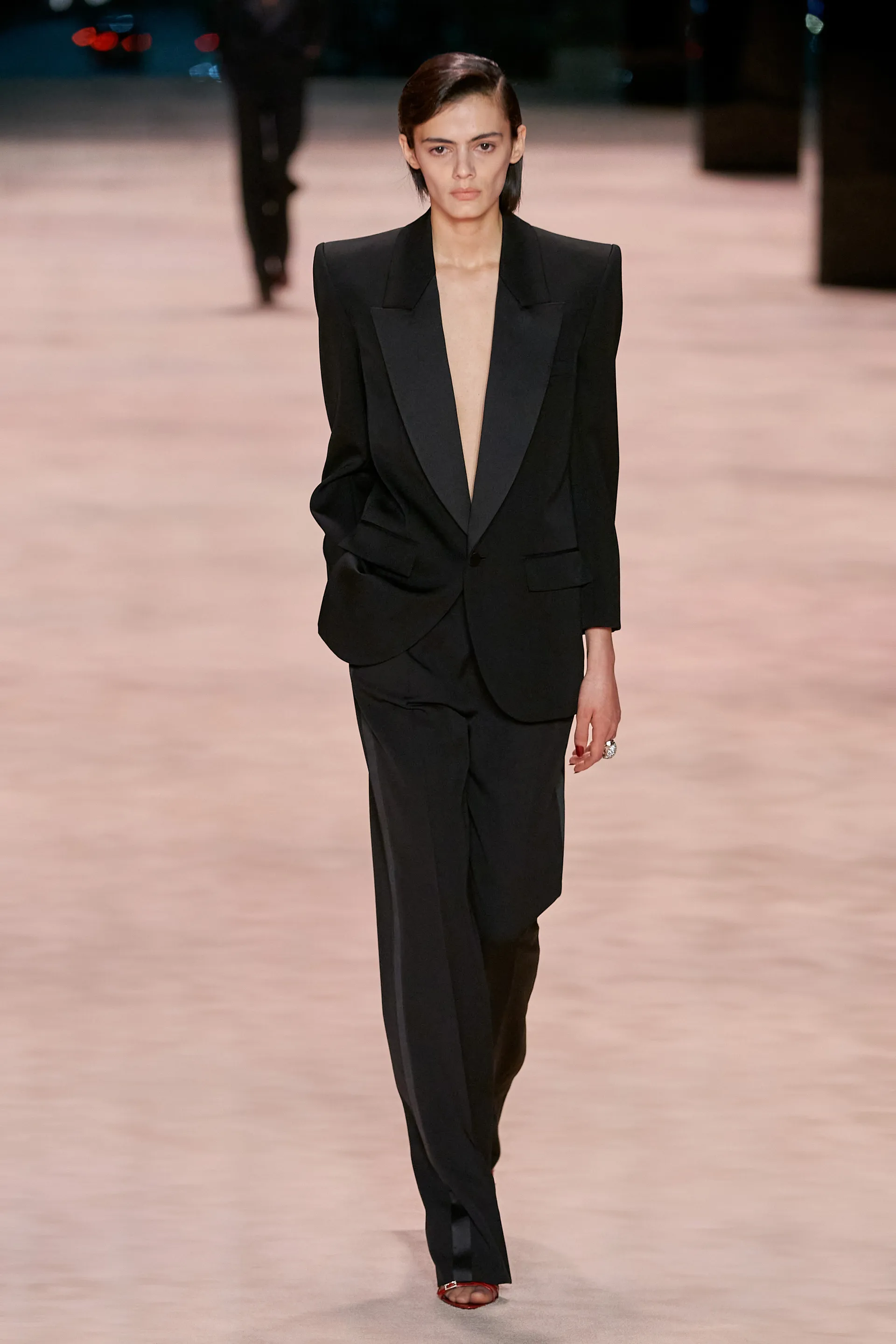 Có thể nói, các đường nét góc cạnh hiện lên trong những kết cấu mềm mại của trang phục, phom dáng dài xung đột kích cỡ, bảng màu đơn sắc cùng chủ nghĩa tối giản đánh dấu sự nổi loạn âm thầm và mỹ cảm tinh tế ngày càng sắc bén của  vị giám đốc sáng tạo đương nhiệm. Cảm hứng cho bộ sưu tập lần này đến từ Nancy Cunard, nhà văn thượng lưu Anh, với "một tủ quần áo nam tính là dấu ấn không thể phai mờ của riêng bà”. Vaccarello cũng tham khảo phong cách đeo vòng tay đặc trưng của Cunard trong bộ sưu tập Thu - Đông 2022 của mình.