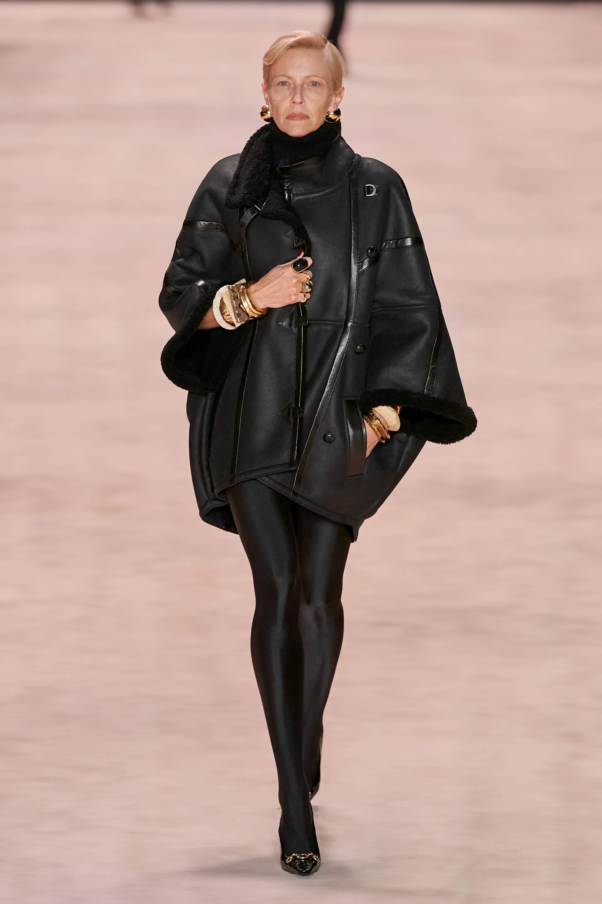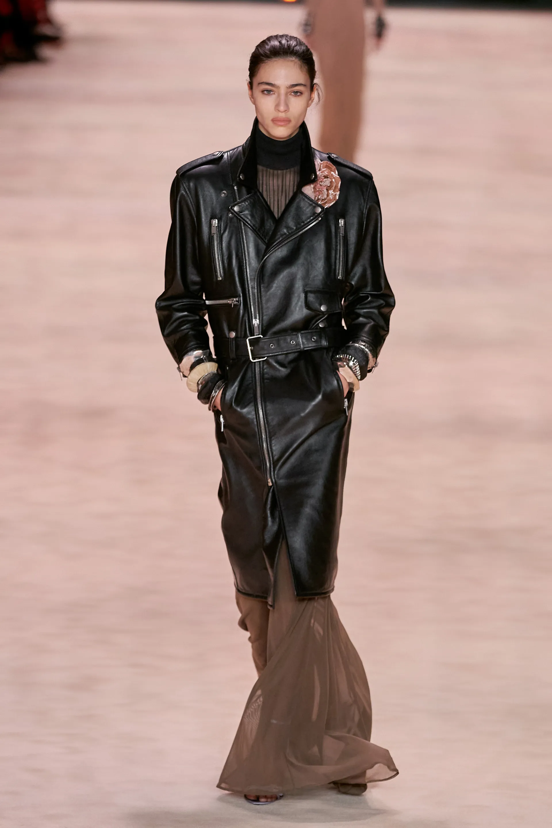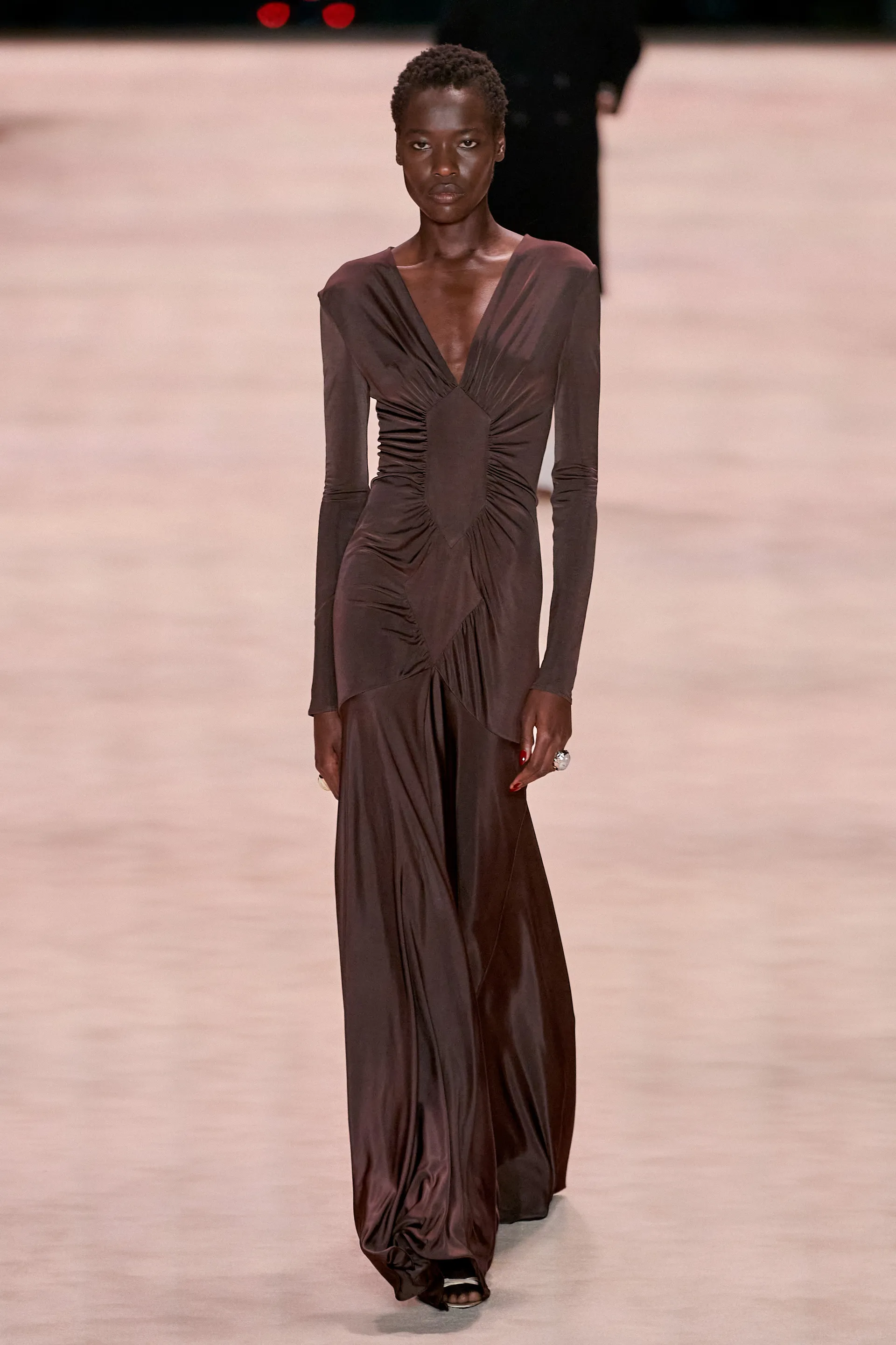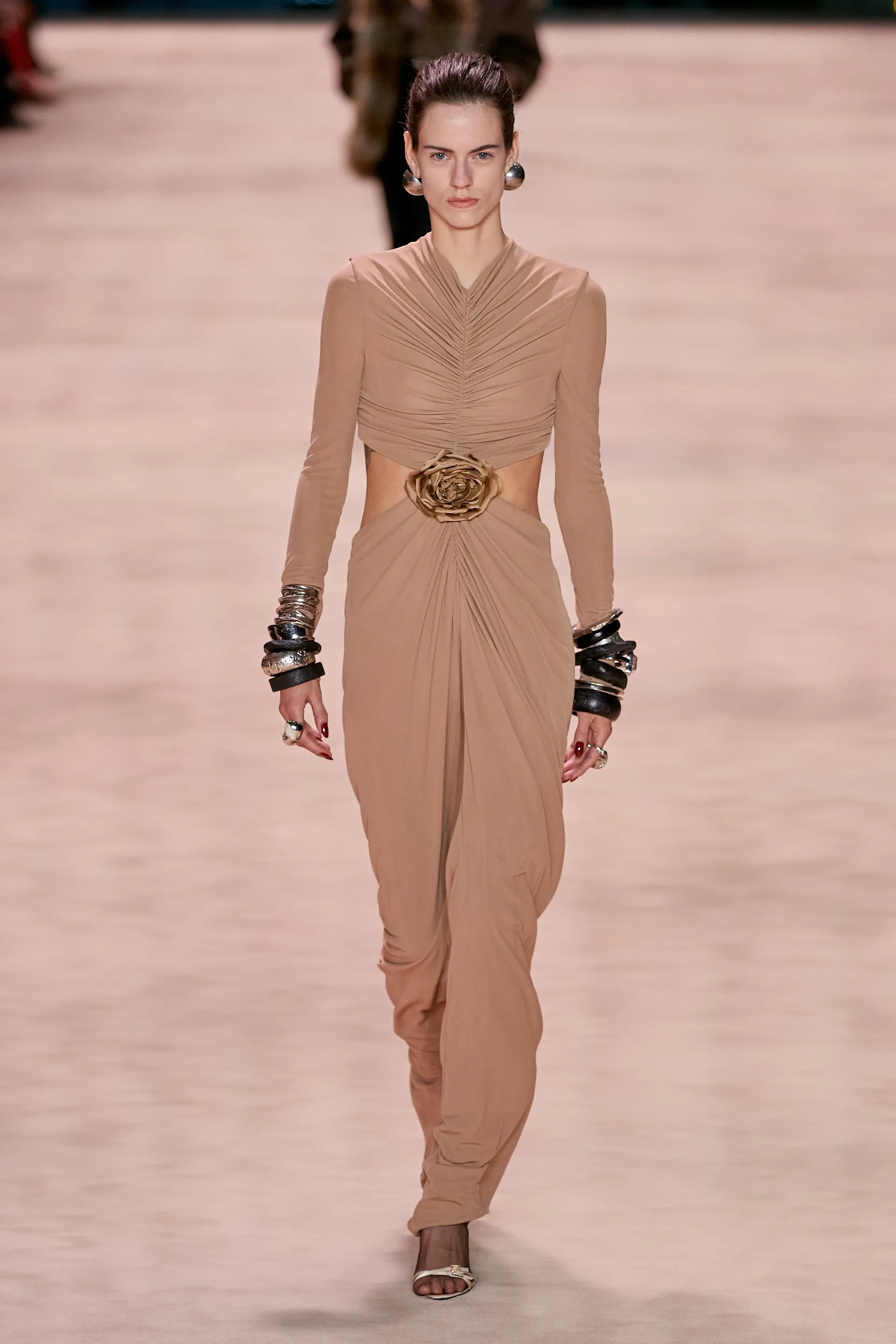 Có thể nói, các đường nét góc cạnh hiện lên trong những kết cấu mềm mại của trang phục, phom dáng dài xung đột kích cỡ, bảng màu đơn sắc cùng chủ nghĩa tối giản đánh dấu sự nổi loạn âm thầm và mỹ cảm tinh tế ngày càng sắc bén của  vị giám đốc sáng tạo đương nhiệm. Cảm hứng cho bộ sưu tập lần này đến từ Nancy Cunard, nhà văn thượng lưu Anh, với "một tủ quần áo nam tính là dấu ấn không thể phai mờ của riêng bà”. Vaccarello cũng tham khảo phong cách đeo vòng tay đặc trưng của Cunard trong bộ sưu tập Thu - Đông 2022 của mình.