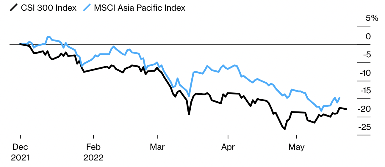 Thị trường chứng khoán Trung Quốc hiện đang ở trong trạng thái thị trường đầu cơ giá xuống (bear market - được định nghĩa bằng mức giảm giá từ 20% trở lên so với đỉnh của một tài sản). Từ đầu năm đến nay, CSI 300 Index - thước đo tham chiếu của chứng khoán Trung Quốc – đã giảm 18% khi chính sách chống Covid nghiêm ngặt và việc thắt chặt kiểm soát đối với các doanh nghiệp trong khu vực kinh tế tư nhân khiến nhà đầu tư suy giảm niềm tin.