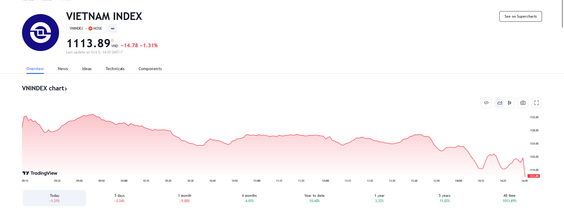 Kết thúc phiên giao dịch ngày 4/10, VN-Index giảm 14,78 điểm, đóng cửa 1.113,89 điểm. Tương tự, HNX-Index giảm 2,19 điểm, đóng cửa 228,01 điểm.
