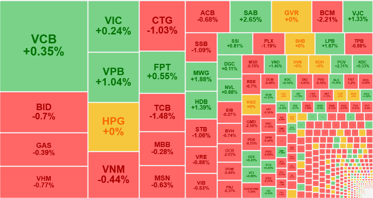 VN-Index kết phiên vẫn đang dưới tham chiếu 2,42 điểm tương đương -0,22%. Đây là mức giảm nhẹ so với biên độ giảm tối đa 8,4 điểm tại đáy lúc 10h22. Nhịp phục hồi xuất hiện trong nửa sau của phiên nhờ nhóm blue-chips hồi trước.