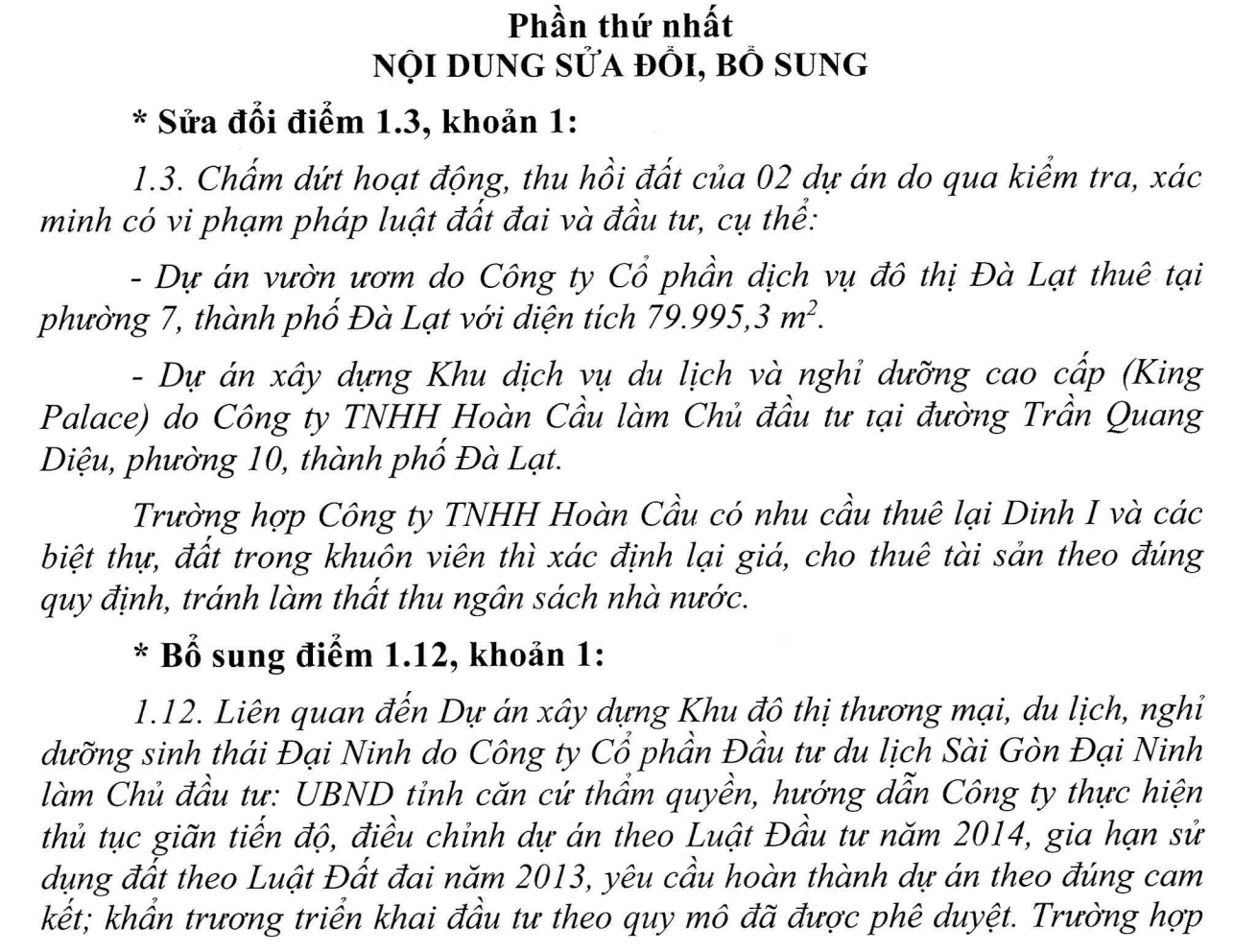 Hai dự án được nhắc tới là dự án vườn ươm do công ty cổ phần dịch vụ đô thị Đà Lạt thuê tại phường 7, thành phố Đà Lạt với diện tích 79.995,3 m2;  và dự án xây dụng khu dịch vụ du lịch và nghỉ dưỡng cao cấp (King Palace) do Công ty Trách nhiệm hữu hạn Hoàn Cầu làm chủ đầu tư tại đường Trần Quang Diệu, phường 10, thành phố Đà Lạt.