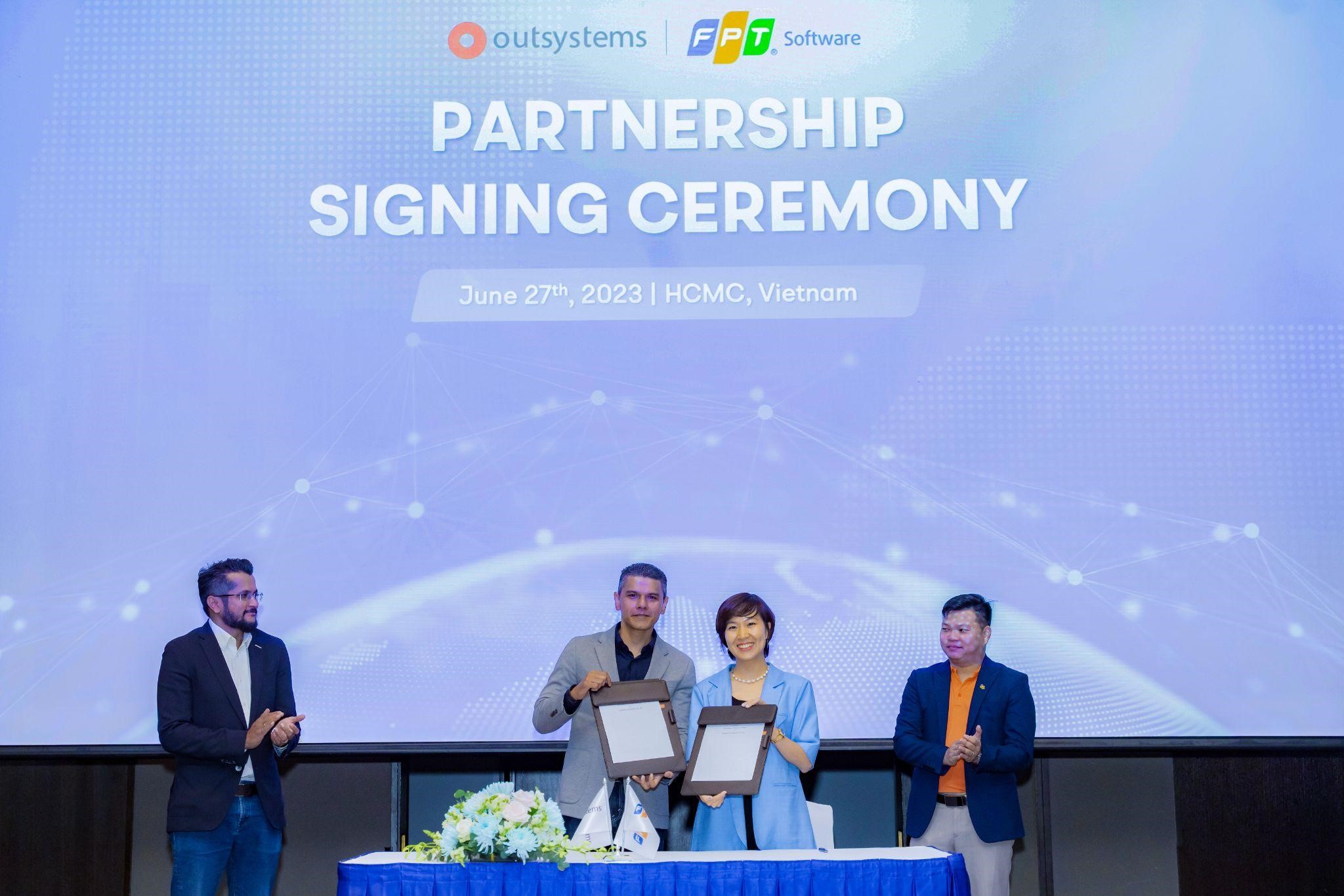 Nhằm đồng hành cùng doanh nghiệp Việt đón đầu công nghệ mới trên hành trình chuyển đổi số, trong buổi hội thảo tổ chức tại Hồ Chí Minh, FPT Software và OutSystems đã ký kết thoả thuận hợp tác. Qua đó, FPT Software sẽ cung cấp dịch vụ trọn gói từ việc phát triển, xây dựng, cài đặt và bảo trì ứng dụng phần mềm trên nền tảng Low-code của OutSystems.