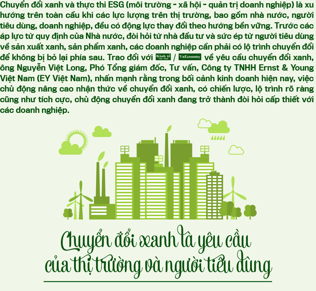 Các doanh nghiệp, đứng trước các áp lực từ quy định của Nhà nước, đòi hỏi từ thị trường, từ nhà đầu tư và sức ép từ người tiêu dùng cũng buộc phải có lộ trình chuyển đổi. Theo tôi, đây là những yếu tố quan trọng nhất, là tiền đề để hình thành và phát triển một nền kinh tế xanh.