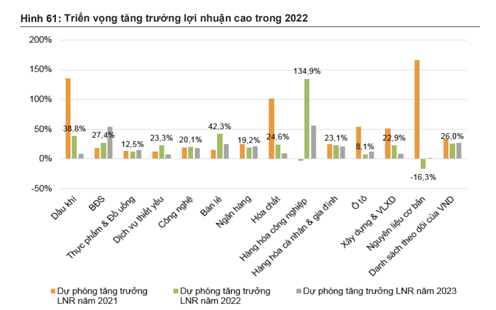 Theo đó, trong năm 2022, VnDirect kỳ vọng tăng trưởng EPS của các công ty niêm yết trên HOSE sẽ tiếp tục duy trì ở mức cao 23% so với cùng kỳ. Một số ngành dự kiến có sự cải thiện mạnh mẽ về tăng trưởng lợi nhuận, bao gồm Hàng hóa công nghiệp và Dịch vụ, Bán lẻ và Bất động sản trong khi tăng trưởng lợi nhuận của Dầu khí, Tiện ích công cộng và Công nghệ vẫn duy trì ở mức cao.