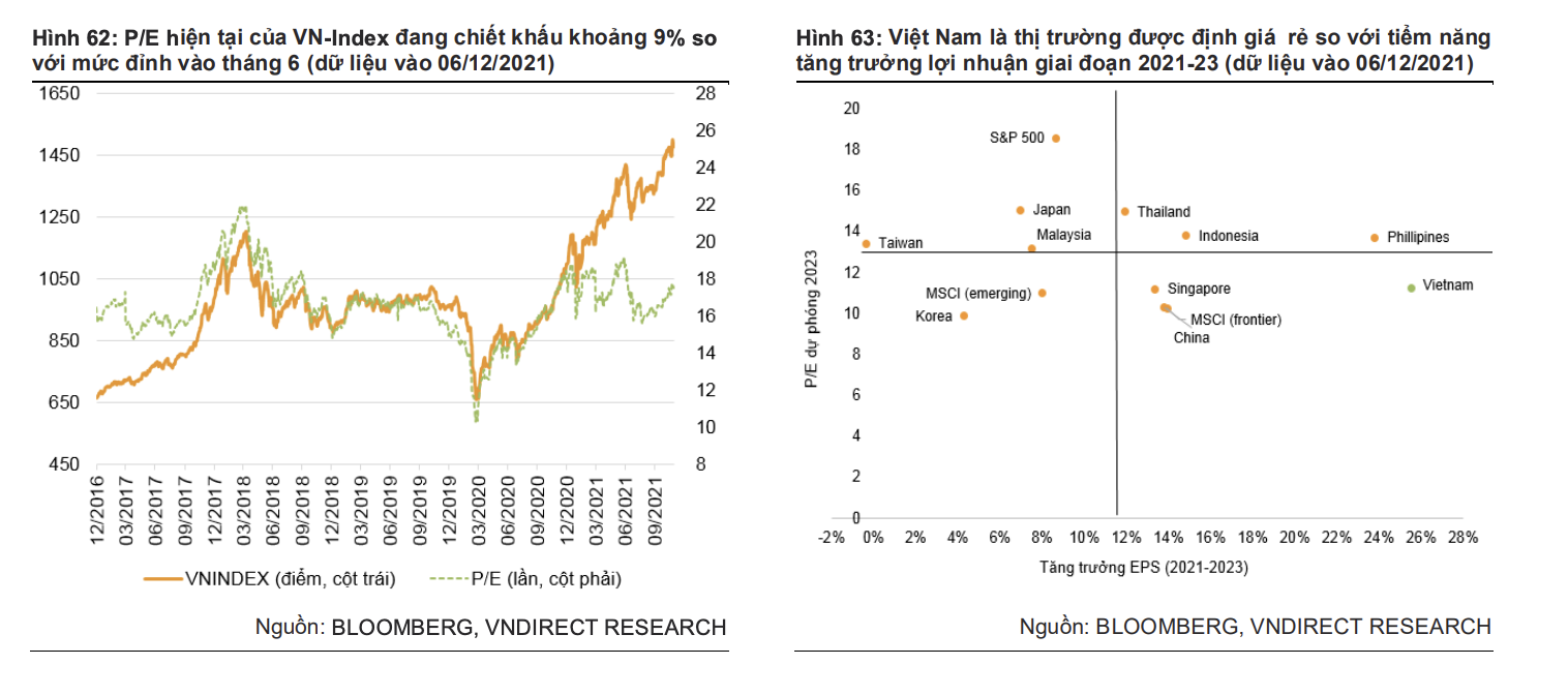 Tại thời điểm ngày 06/12/2021, theo dữ liệu của Bloomberg, VN-Index đang giao dịch ở mức P E trượt 12 tháng là 16,7 lần, thấp hơn một chút so với mức P/E hồi đầu năm 2021 ở mức 17,3 lần. Định giá thị trường vẫn đang ở mức hấp dẫn với P/E dự phóng 2022 và 2023 lần lượt ở mức là 13,4 lần và 11,5 lần (thấp hơn P/E trung bình 3 năm gần nhất là 16,1 lần).