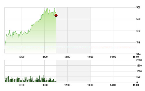 Tuy nhiên, sức kéo điểm số sáng nay vẫn phụ thuộc hầu hết vào các cổ phiếu lớn. VN-Index tăng tới 0,99% và đã giành lại được mốc 550 điểm, đạt 550,57 điểm. Mức điểm số này đã là thụt lùi một chút về cuối phiên do sức mua chững lại. Đỉnh cao của chỉ số này sáng nay đạt 551,83 điểm.