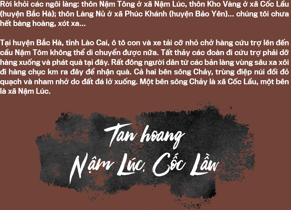 Từ cầu Nậm Tôm, chúng tôi phải chuyển quà cứu trợ sang xe công nông, từ đây người và quà phải đi 8 km nữa để đến thôn Kho Vàng của xã Cốc Lầu và thôn Nậm Tông của xã Nậm Lúc dài 9 km. Suốt dọc đường đi, cảnh tượng vô cùng khủng khiếp, không chỉ đất trên núi lở trùm xuống gần hết con đường, mà dưới đường chỗ nào đất cũng nứt toác. Ngồi trên xe công nông luôn thấy bất an, xe nghiêng ngả, cảm giác đất dưới đường sẵn sàng sụt xuống kéo theo người và xe xuống sông bất cứ lúc nào.