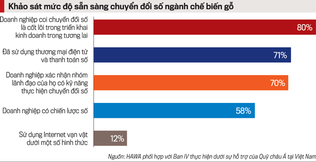 Báo cáo đánh giá mức độ sẵn sàng chuyển đổi số ngành chế biến gỗ do HAWA phối hợp với Ban IV thực hiện dưới sự hỗ trợ của Quỹ châu Á tại Việt Nam, cho thấy gần 58% người được hỏi xác nhận rằng công ty họ có chiến lược số, gần 80% người được hỏi xác nhận rằng chuyển đổi số là cốt lõi trong việc triển khai kinh doanh chiến lược của họ trong tương lai, gần 70% người được hỏi xác nhận nhóm lãnh đạo của họ có kỹ năng cần thiết để thực hiện chuyển đổi số. Có 71% người đã sử dụng thương mại điện tử và thanh toán số, gần 12% sử dụng Internet vạn vật dưới một số hình thức.