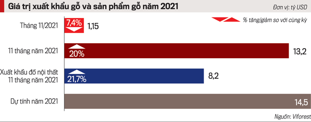 Động lực tăng trưởng của ngành gỗ tập trung lớn vào nhóm hàng đồ nội thất. Trị giá xuất khẩu nhóm hàng này chiếm 67,6% tổng trị giá xuất khẩu gỗ và sản phẩm gỗ trong 11 tháng năm 2021, đạt 8,2 tỷ USD, tăng 21,7% so với cùng kỳ năm 2020. Đến thời điểm tháng 12/2021, tình hình sản xuất đã trở lại bình thường và các doanh nghiệp ngành gỗ đang tăng tốc sản xuất để kịp đơn hàng xuất khẩu đã ký. Dự tính cả năm 2021 trị giá xuất khẩu gỗ và sản phẩm gỗ sẽ đạt 14,5 tỷ USD.