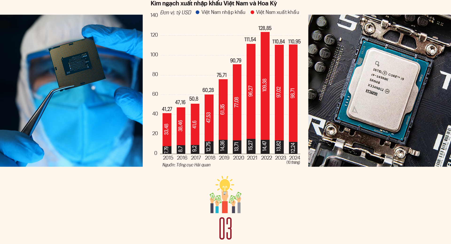 Mỹ vẫn là thị trường xuất khẩu lớn nhất của Việt Nam trong năm 2023, với giá trị xuất khẩu đạt khoảng 100 tỷ USD, gấp đôi so với thị trường lớn thứ hai là Trung Quốc. Điều này phản ánh mối quan hệ kinh tế quan trọng giữa Việt Nam và Mỹ. Việc nâng cấp quan hệ thành Đối tác chiến lược toàn diện giữa Việt Nam và Mỹ đánh dấu một cột mốc quan trọng, phản ánh sự sâu sắc và rộng lớn của mối quan hệ song phương, mở ra những cơ hội hợp tác mới trong các ngành chiến lược, bao gồm bán dẫn (một lĩnh vực mà Việt Nam đã trở thành một bên hưởng lợi quan trọng từ các xu hướng và chính sách toàn cầu như Đạo luật CHIPS của Mỹ), năng lượng tái tạo, chuyển đổi số và sản xuất tiên tiến.