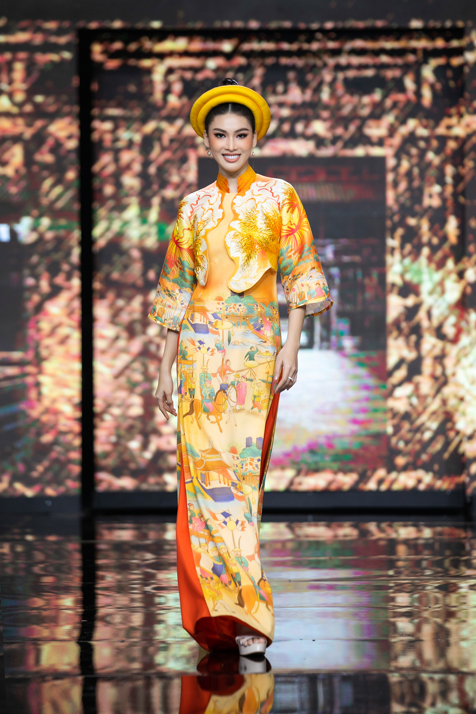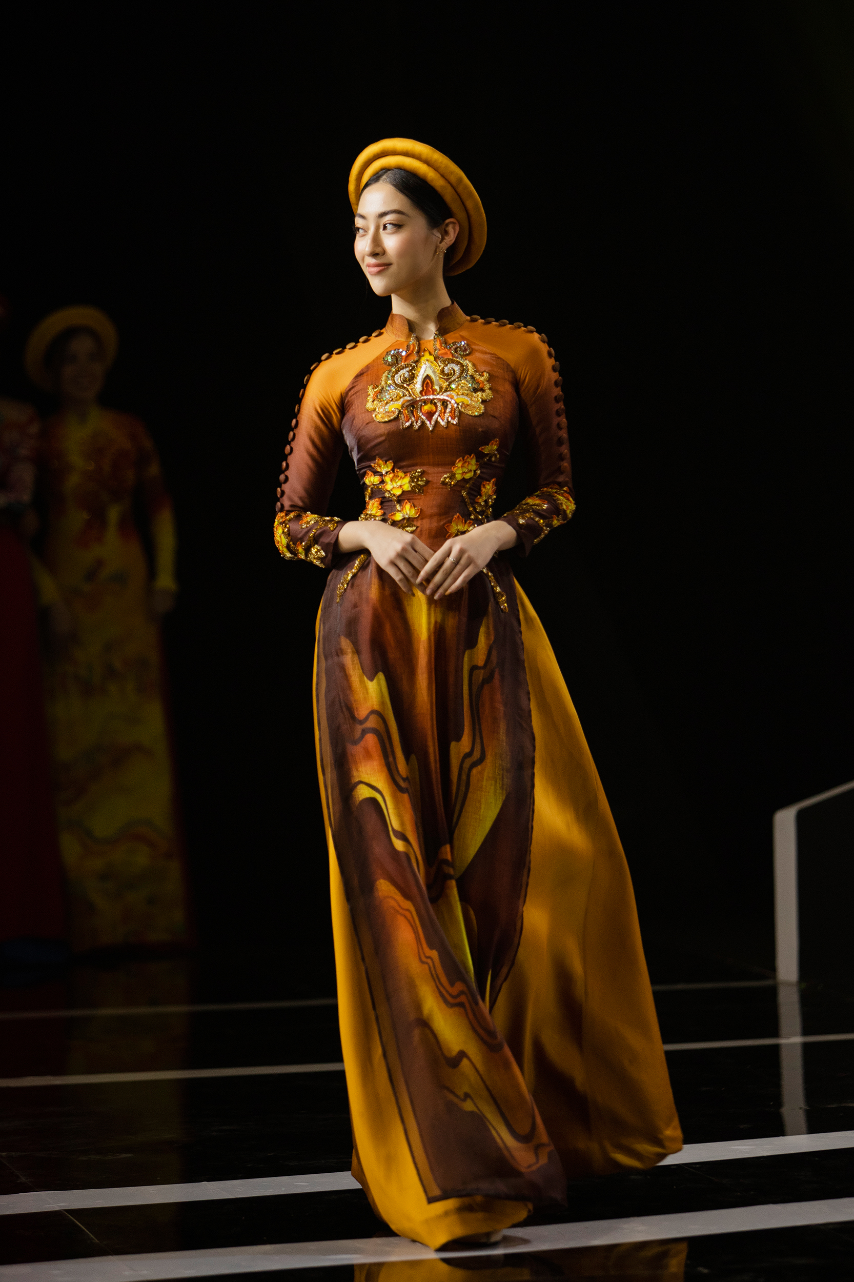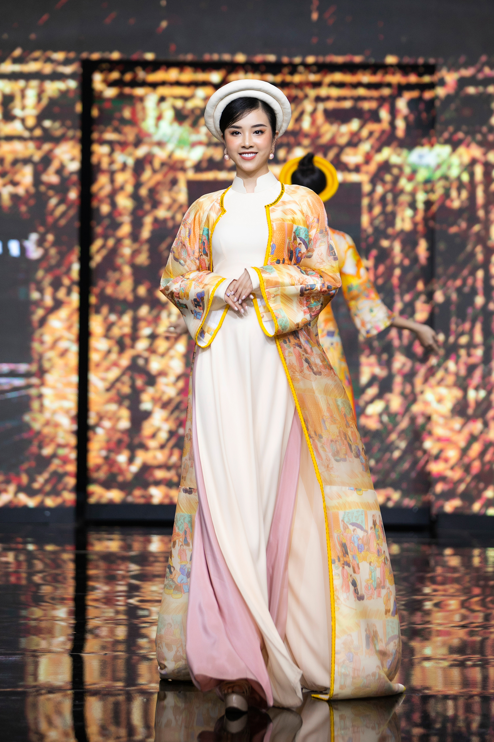Nhà mốt La Sen Vũ từ lâu đã được biết đến với những thiết kế đậm nét văn hóa người Việt, mỗi bộ áo dài đều được đầu tư, lên ý tưởng độc đáo kết hợp với những đường cắt may mới mẻ. Cùng với dàn Hoa Á hậu và các thí sinh bước ra từ chương trình The Next Face Vietnam 2021, thương hiệu La Sen Vũ đã mang đến cho khán giả BST Mơ Xuân được lấy cảm hứng chính từ dòng tranh Kim Hoàng.