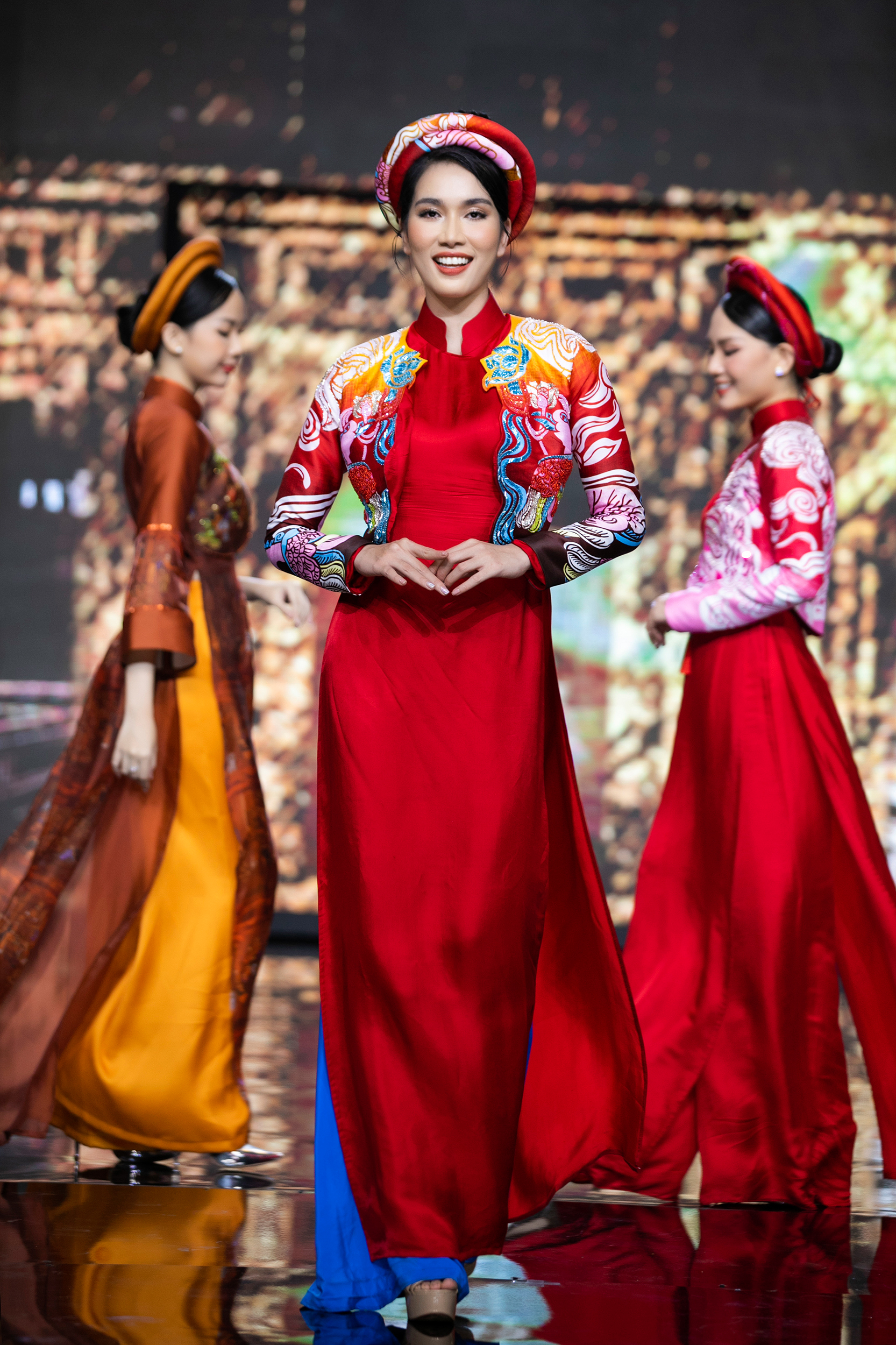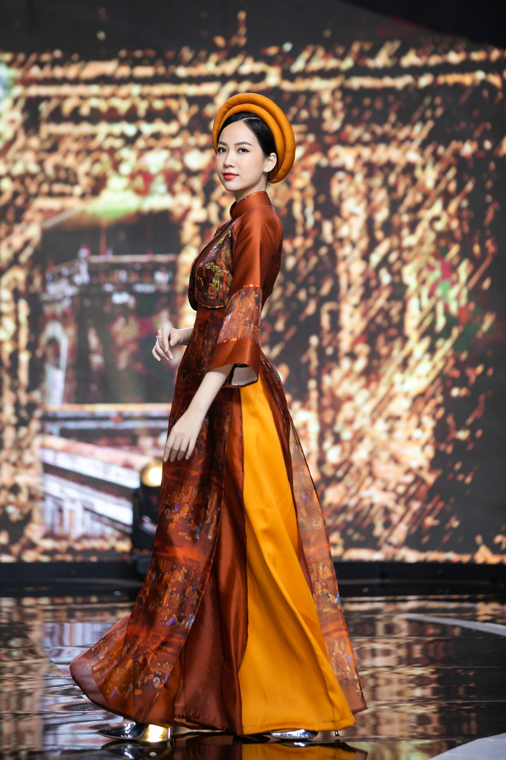 Không những vậy, NTK La Sen Vũ lựa chọn những gam màu nóng cho các thiết kế lần này như đỏ, nâu đất, hồng, vàng đất. Đây không chỉ là tông màu chính của giấy vẽ trong dòng tranh Kim Hoàng, mà còn là sắc màu nhuộm kín không gian ngày Tết ở Việt Nam. Với mong muốn nâng tầm sự hòa quyện nghệ thuật hoài cổ và đương đại, NTK La Sen Vũ đã tinh tế kết hợp phom áo dài truyền thống với những điểm nhấn nhẹ như tay loe, tay bồng,… và áo khoác lửng sở hữu họa tiết đính kết nổi bật.