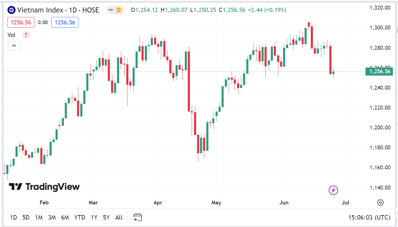 "Sau phiên giảm mạnh khá đột biến cả điểm số và khối lượng giao dịch, một phần nguyên nhân đến từ áp lực tái cơ cấu danh mục cuối Quí II/2024, cũng như kiểm soát tỉ lệ dư nợ cuối quí, VN-Index đang nỗ lực phục hồi ở vùng hỗ trợ tâm lý mạnh quanh 1.250 điểm, cũng là vùng hỗ trợ quan trọng đối với xu hướng tăng ngắn-trung hạn hiện nay. Trong phiên hôm nay VN-Index phục hồi ở vùng giá 1.250 điểm, kết phiên VN-Index tăng nhẹ 2,44 điểm ( 0,19%) lên mức 1.256,56 điểm, thanh khoản giảm thể hiện mức độ phục hồi kém ở nhiều mã/nhóm mã.
