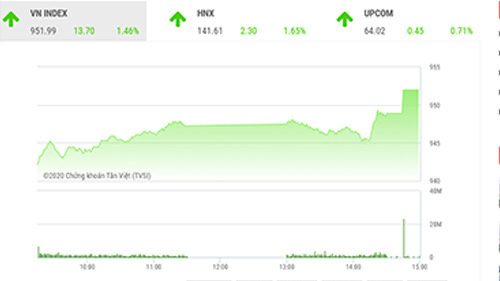 "VN-Index đóng cửa tại 951,99 điểm, tăng 13,7 điểm. Độ rộng thị trường nghiêng mạnh về số mã tăng giá. Trong khi đó thanh khoản đạt 7.052 tỷ, tăng 48,6% lên trên mức bình quân 20 phiên gần nhất.