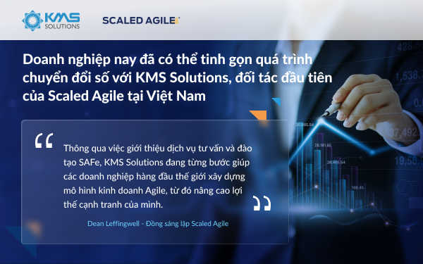 “Cơ hội làm việc với các đối tác hàng đầu như KMS Solutions thể hiện sứ mệnh của Scaled Agile trên hành trình giúp doanh nghiệp tăng tốc thời gian đưa sản phẩm mới ra thị trường, cũng như cải thiện hiệu suất làm việc của nhân viên, từ đó giải quyết bài toán phát triển phần mềm để chuyển đổi số hiệu quả hơn,” ông Dean Leffingwell, đồng sáng lập Scaled Agile và là chuyên gia đằng sau mô hình SAFe nổi tiếng. “Thông qua việc giới thiệu dịch vụ tư vấn và đào tạo SAFe, KMS Solutions đang từng bước giúp các doanh nghiệp hàng đầu thế giới xây dựng mô hình kinh doanh Agile, từ đó nâng cao lợi thế cạnh tranh của mình.”