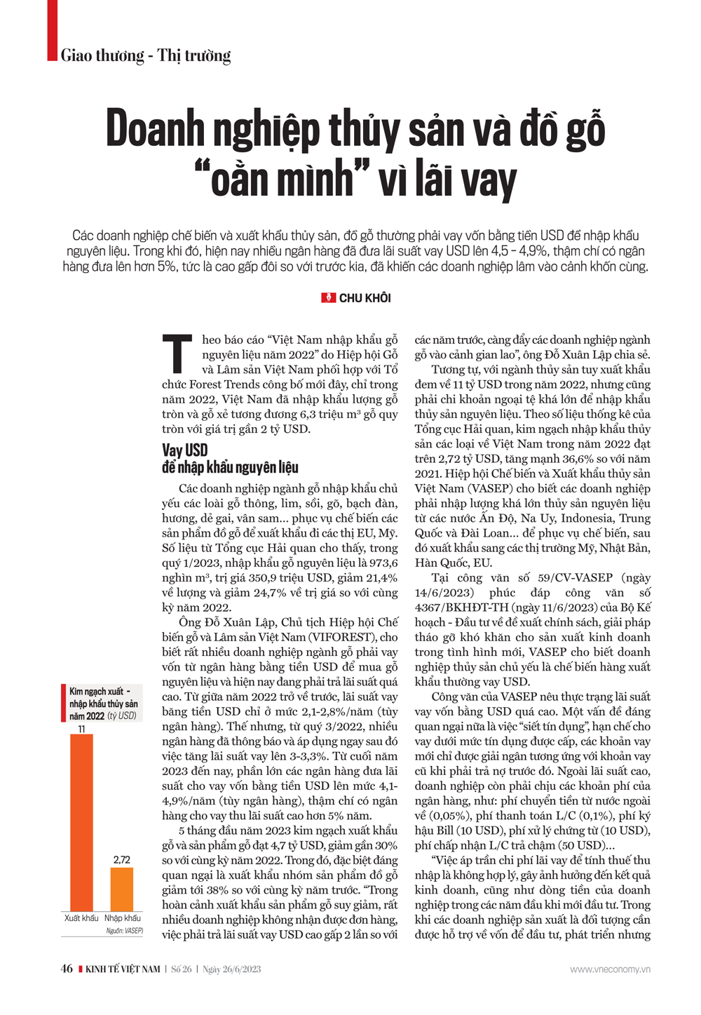 Ông Đỗ Xuân Lập, Chủ tịch Hiệp hội Chế biến gỗ và Lâm sản Việt Nam (VIFOREST), cho biết rất nhiều doanh nghiệp ngành gỗ phải vay vốn từ ngân hàng bằng tiền USD để mua gỗ nguyên liệu và hiện nay đang phải trả lãi suất quá cao.