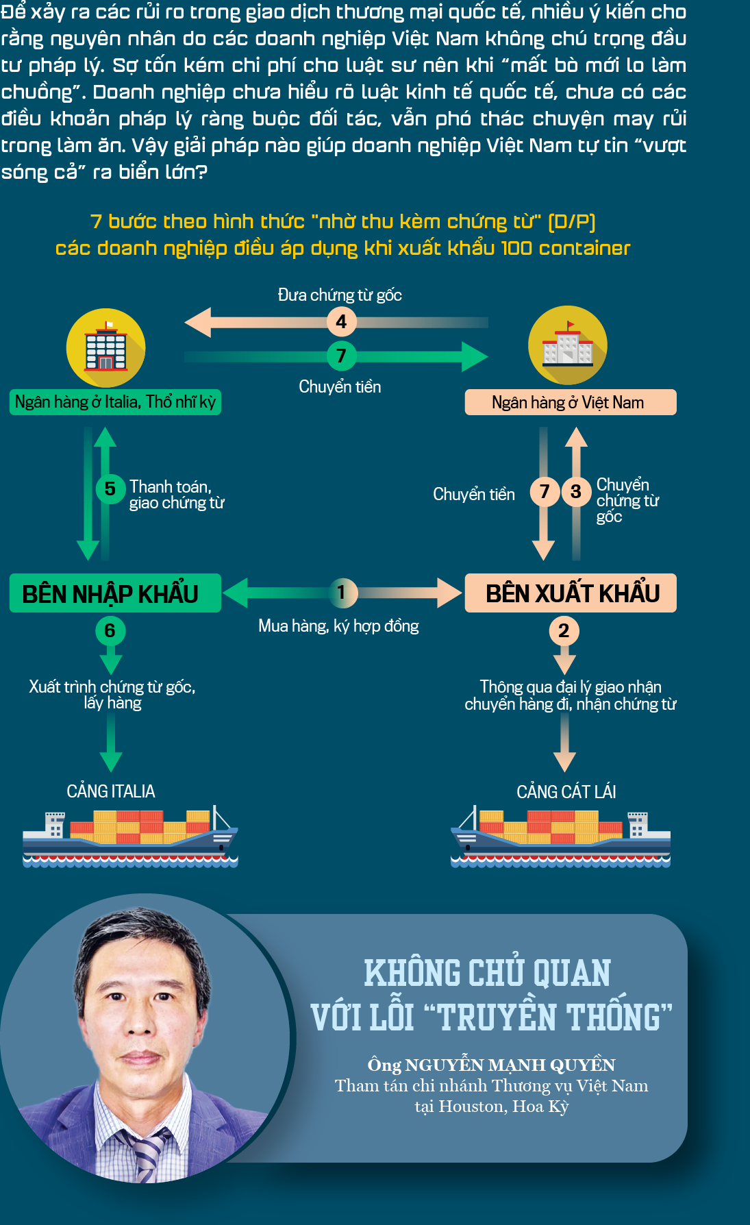 “Tranh chấp xảy ra trong kinh doanh nói chung hay thương mại quốc tế nói riêng là điều không thể tránh khỏi. Khi xảy ra tranh chấp, trước hết doanh nghiệp cần phải nhận định rõ ràng rủi ro để từ đó có cách tiếp cận phù hợp. Cụ thể là rủi ro xảy ra có phải là lừa đảo, tức là có yếu tố hình sự hay không. Còn nếu như không phải hay chưa đến thì sự việc mới dừng lại ở mức độ tranh chấp.