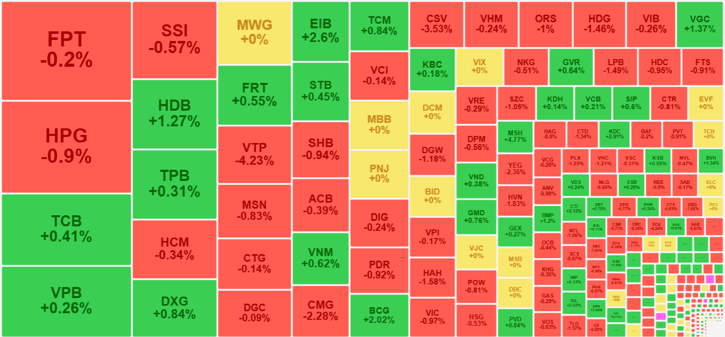 Chỉ số cho tới phút cuối của đợt khớp lệnh liên tục đã tăng nhẹ 0,39 điểm nhưng đóng cửa lại thành giảm 1,51 điểm (-0,12%). VN30-Index cũng đỏ 0,93 điểm. Nhiều cổ phiếu lớn tụt giá trong đợt ATC như HPG, VIC, BID, CTG khiến VN-Index bị tác động nhẹ.