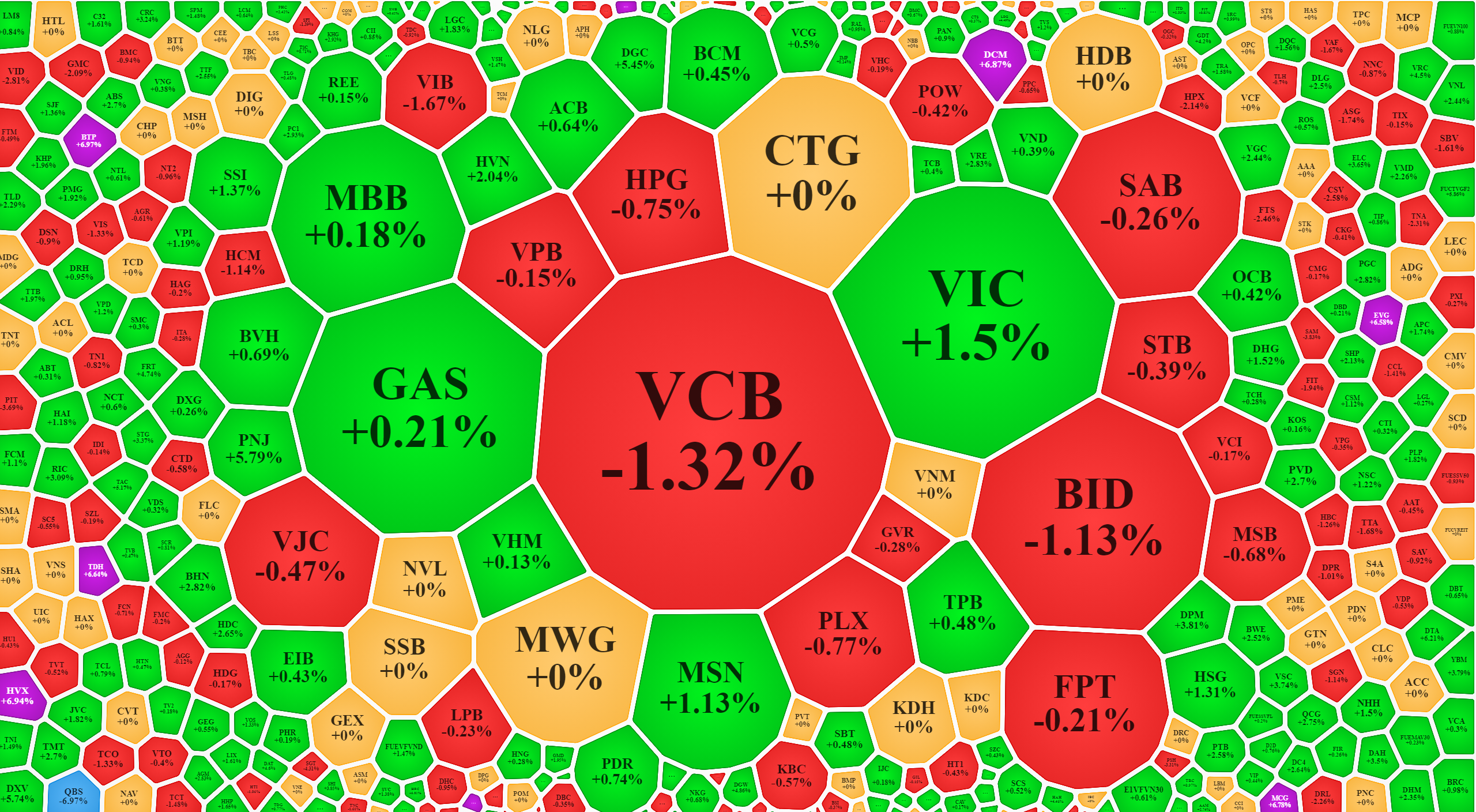 Tính chung cả phiên thì VIC tăng 1,5% và VCB giảm 1,32% là hai mã lớn nhất triệt tiêu lẫn nhau. Tuy nhiên riêng trong buổi chiều thì VIC cũng đứng im, không đẩy được chỉ số thêm chút nào. VCB thì đuối hơn, giảm tiếp một nhịp nữa. Cuối phiên sáng mã này mới giảm 0,91%.