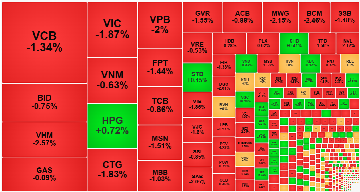 Thanh khoản khớp lệnh 2 sàn tụt xuống mức thấp nhất 15 phiên và cổ phiếu lao dốc cả loạt, xác nhận dòng tiền đang hạn chế bắt đáy. Cả rổ VN30 chỉ còn 3 mã tăng và trong Top 10 vốn hóa lớn nhất, còn đúng HPG đang tăng nhẹ. VN-Index bốc hơi 12,75 điểm tương đương -1,04% và đang chốt sát đáy thấp nhất phiên.