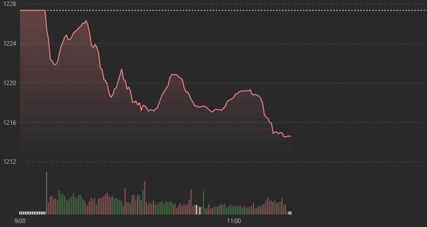VN-Index kết phiên sáng rơi xuống mức 1.214,61 điểm, tức là thủng đáy thấp nhất của giai đoạn đi ngang 5 phiên tuần trước. Chỉ số cũng đã chạm mức hỗ trợ kỹ thuật quan trọng tương đương trung bình 20 phiên.
