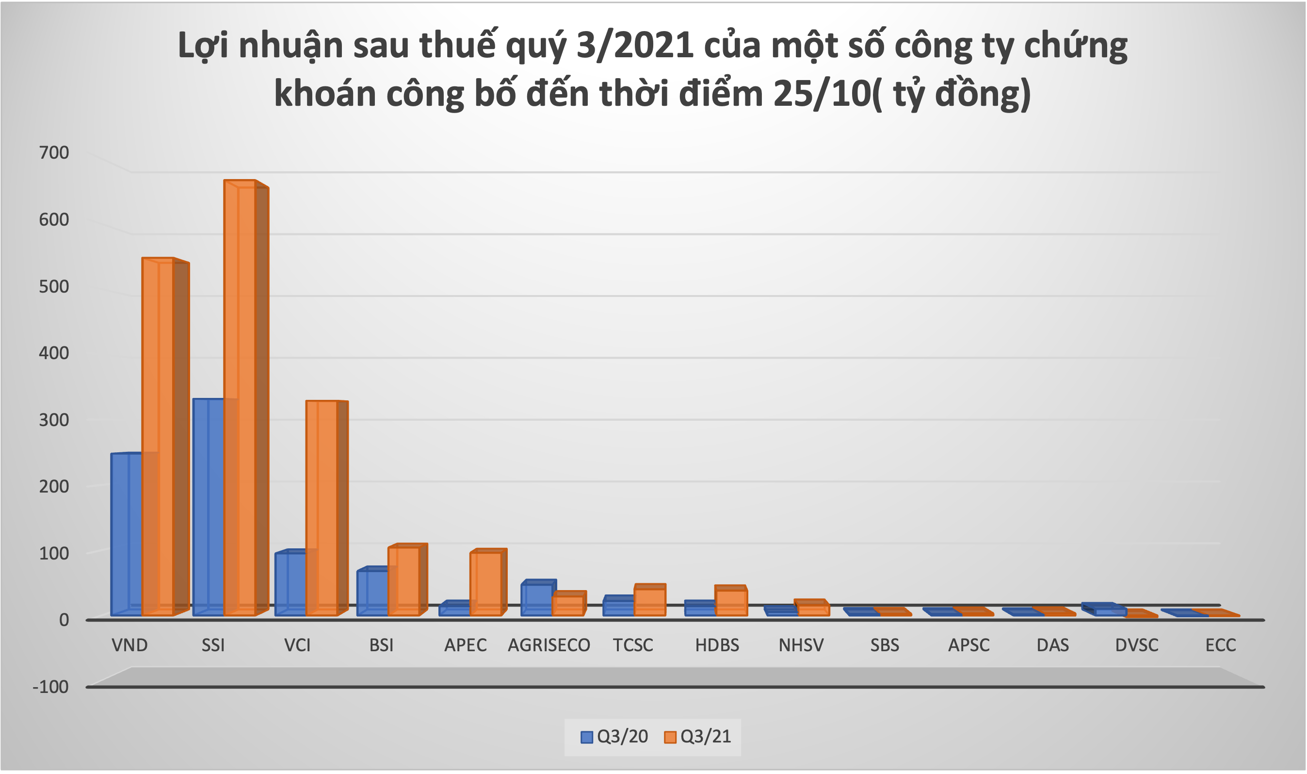 Chứng khoán SSI ghi nhận lợi nhuận sau thuế quý 3/2021 của SSI là 667 tỷ đồng, tăng gần 2 lần so với quý 3/2020. Sau khi công bố lợi nhuận, cổ phiếu SSI cũng lao đầu giảm 7% trong vòng một tuần giao dịch. Chứng khoán VND cũng ghi nhận lợi nhuận tăng trưởng gấp đôi, đạt 548 tỷ đồng, tuy nhiên, cổ phiếu VND cũng giảm 5,7% trong 4 phiên gần đây. Chứng khoán VCI lợi nhuận tăng 3,5 lần so với cùng kỳ năm ngoái nhưng cổ phiếu cũng tuột dốc, giảm 6% trong một tuần trở lại.