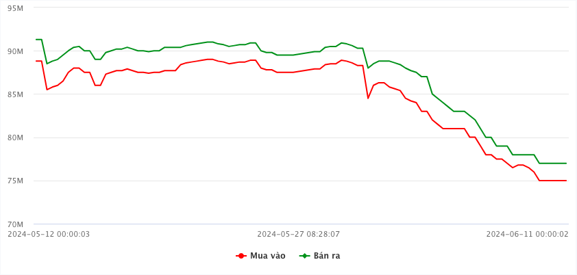 Đây là ngày thứ 4 liên tiếp kể từ phiên 6/6 nhà điều hành giữ mức giá bán ra ở 75,98 triệu đồng/lượng. Theo đó, giá bán vàng miếng tại SJC và 4 ngân hàng sáng nay cũng duy trì 76,98 triệu đồng/lượng, cao hơn 1 triệu đồng mỗi lượng so với giá nhập trực tiếp từ Ngân hàng Nhà nước và là mức giá thấp nhất kể từ ngày 30/1/2024 (78 triệu đồng/lượng).