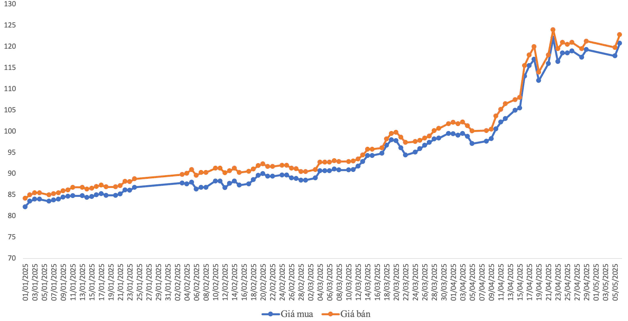 Tính đến 14h30 ngày 6/5/2025, Công ty SJC niêm yết giá mua vào vàng miếng ở mức 120,8 triệu đồng/lượng và giá bán ra là 122,8 triệu đồng/lượng, tăng 3 triệu đồng đối với cả hai chiều so với chốt phiên 5/5.
